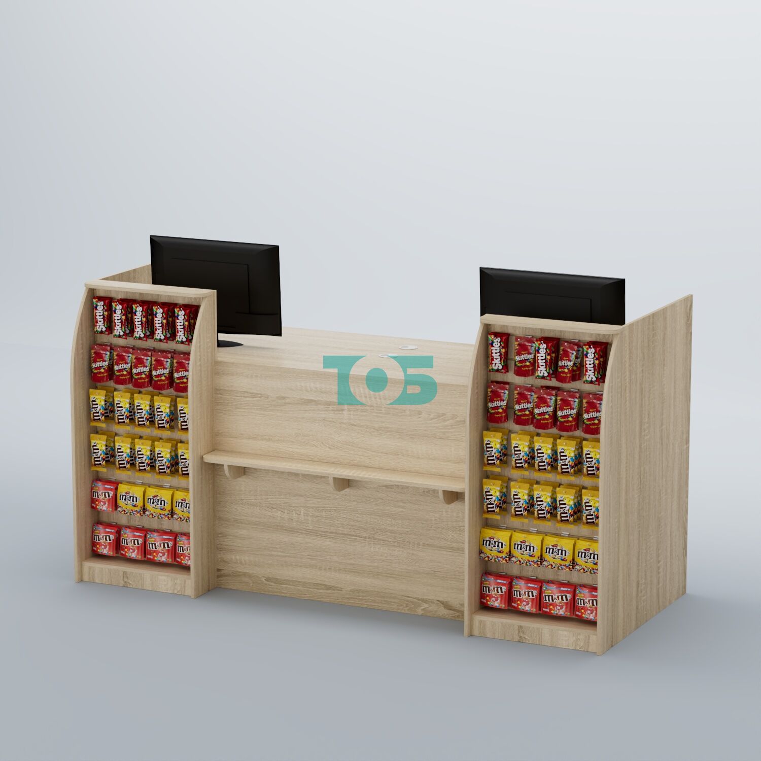 Ресепшен Атлант с фасадными наклонными экономпанелями №4 представляет собой новую линию ресепшенов, разработанную с учетом многолетнего опыта нашей компании и пожеланий клиентов. Эта модель идеально подходит для магазинов одежды, обуви, косметики, парфюмерии, постельного белья и подарков, обеспечивая максимальную функциональность и удобство для двух продавцов.