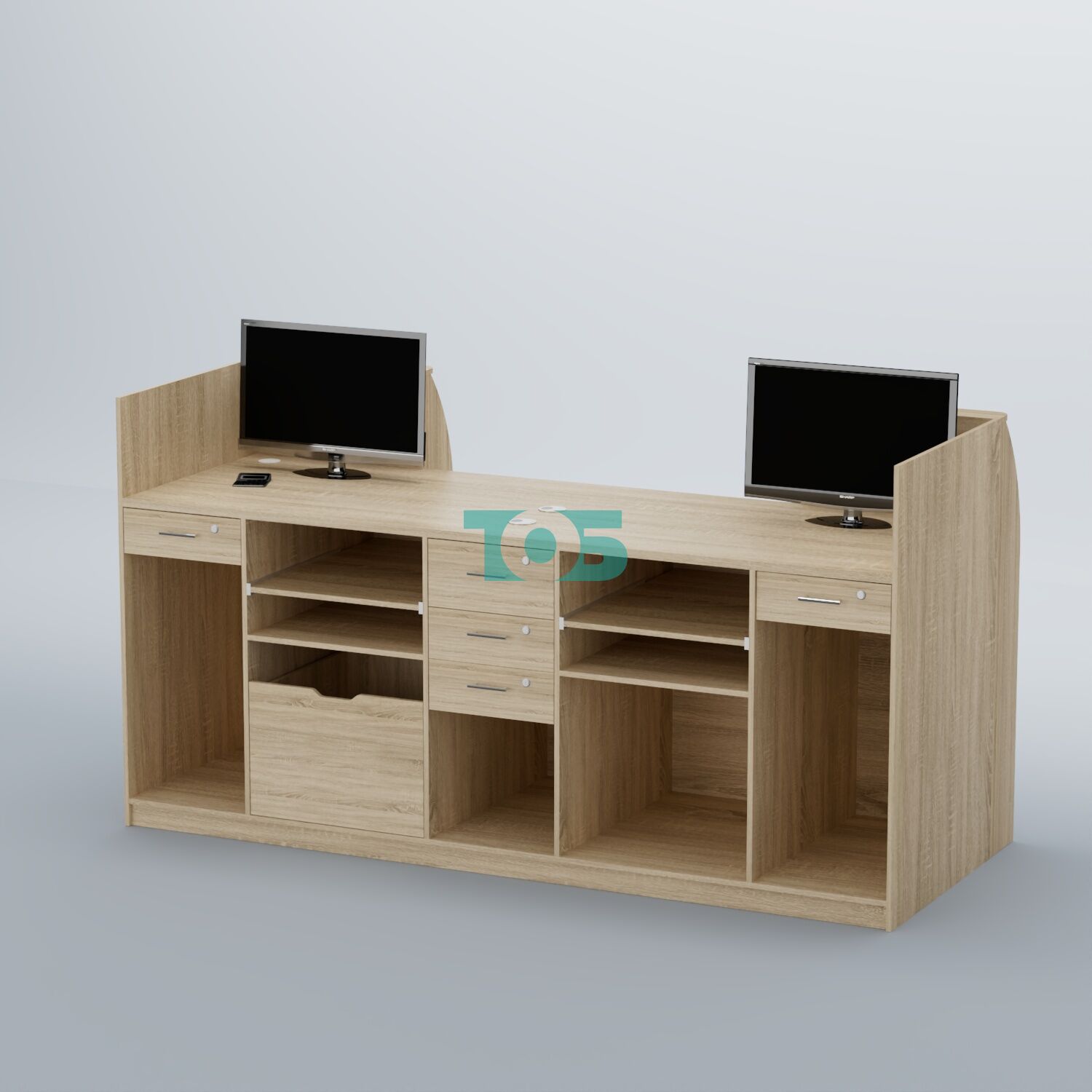 Правый и левый отсек относительно центра ресепшена укомплектован выдвижными полками и одним глубоким выдвижным ящиком.