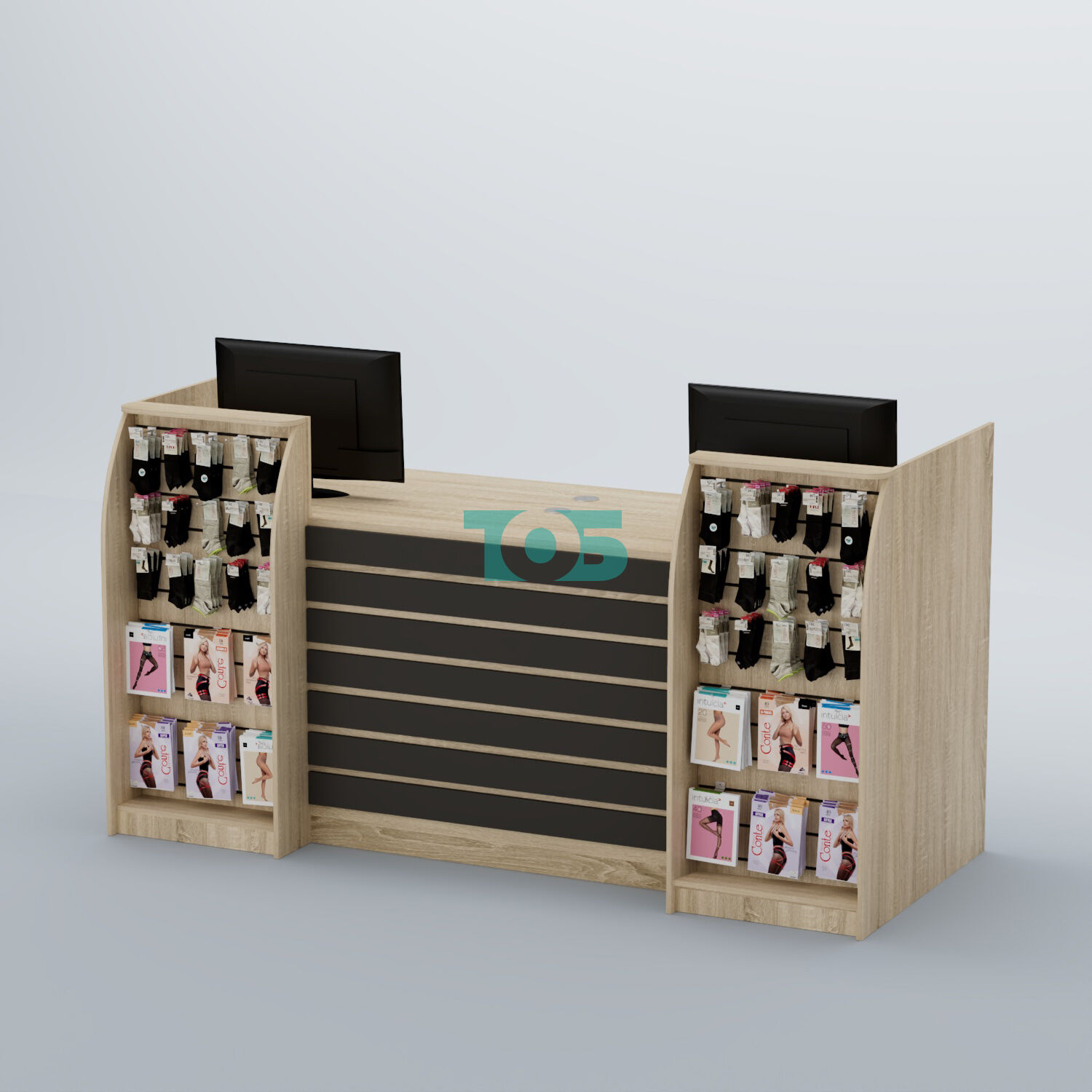 Ресепшен Атлант с накладными планками и экономпанелями №8 представляет собой новую линию ресепшенов, разработанную с учетом многолетнего опыта нашей компании и пожеланий клиентов. Эта модель идеально подходит для магазинов одежды, обуви, косметики, парфюмерии, постельного белья и подарков, обеспечивая максимальную функциональность и удобство для двух продавцов.