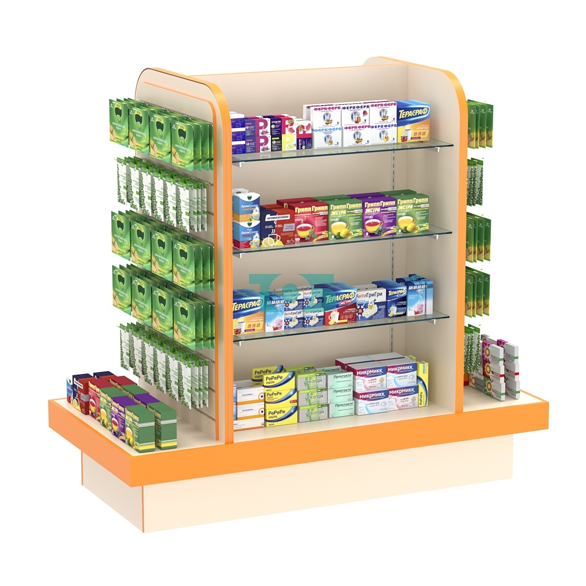 Островная система ФАРМА №3 представляет собой готовое решение для оснащения торговых залов аптек. Она состоит из центрального модуля и двух торцевых модулей с экономпанелями, что позволяет создать функциональное и эстетически привлекательное рабочее пространство.