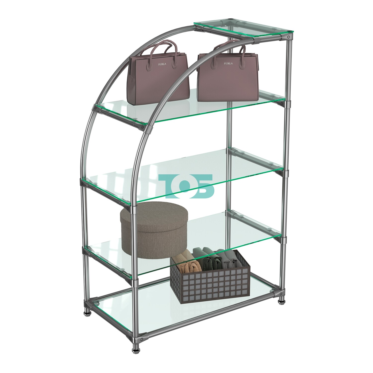 Пять прозрачных полок из стекла толщиной 6 мм: Прочные и безопасные, они позволяют демонстрировать товары с максимальным удобством.