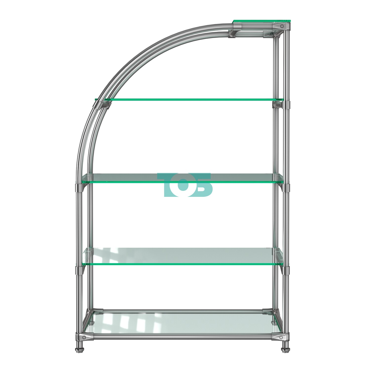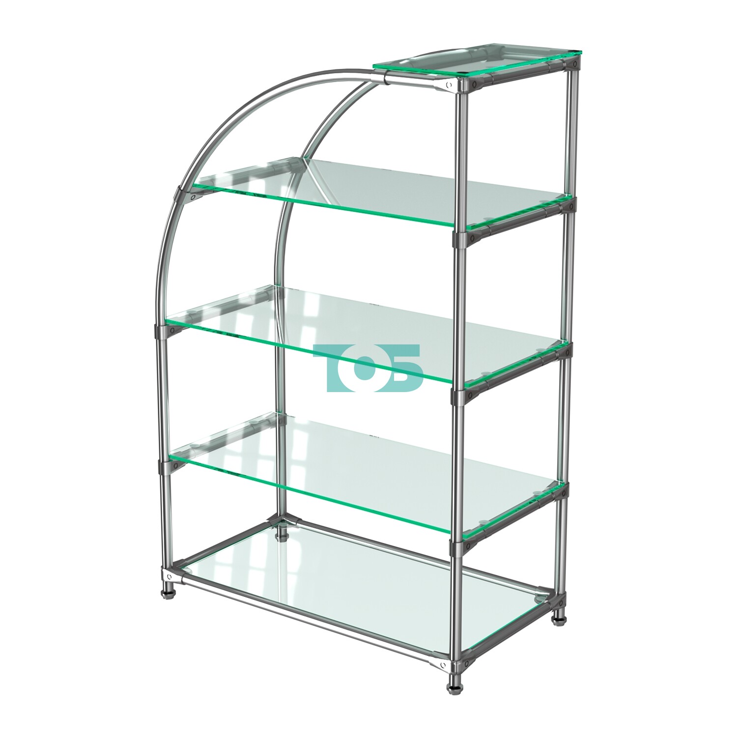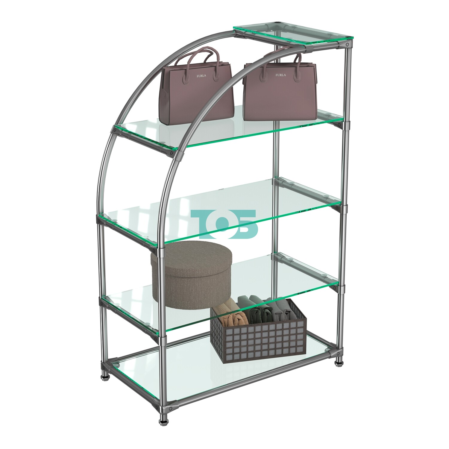 Пять прозрачных полок из стекла толщиной 8 мм: Прочные и безопасные, они позволяют демонстрировать товары с максимальным удобством.