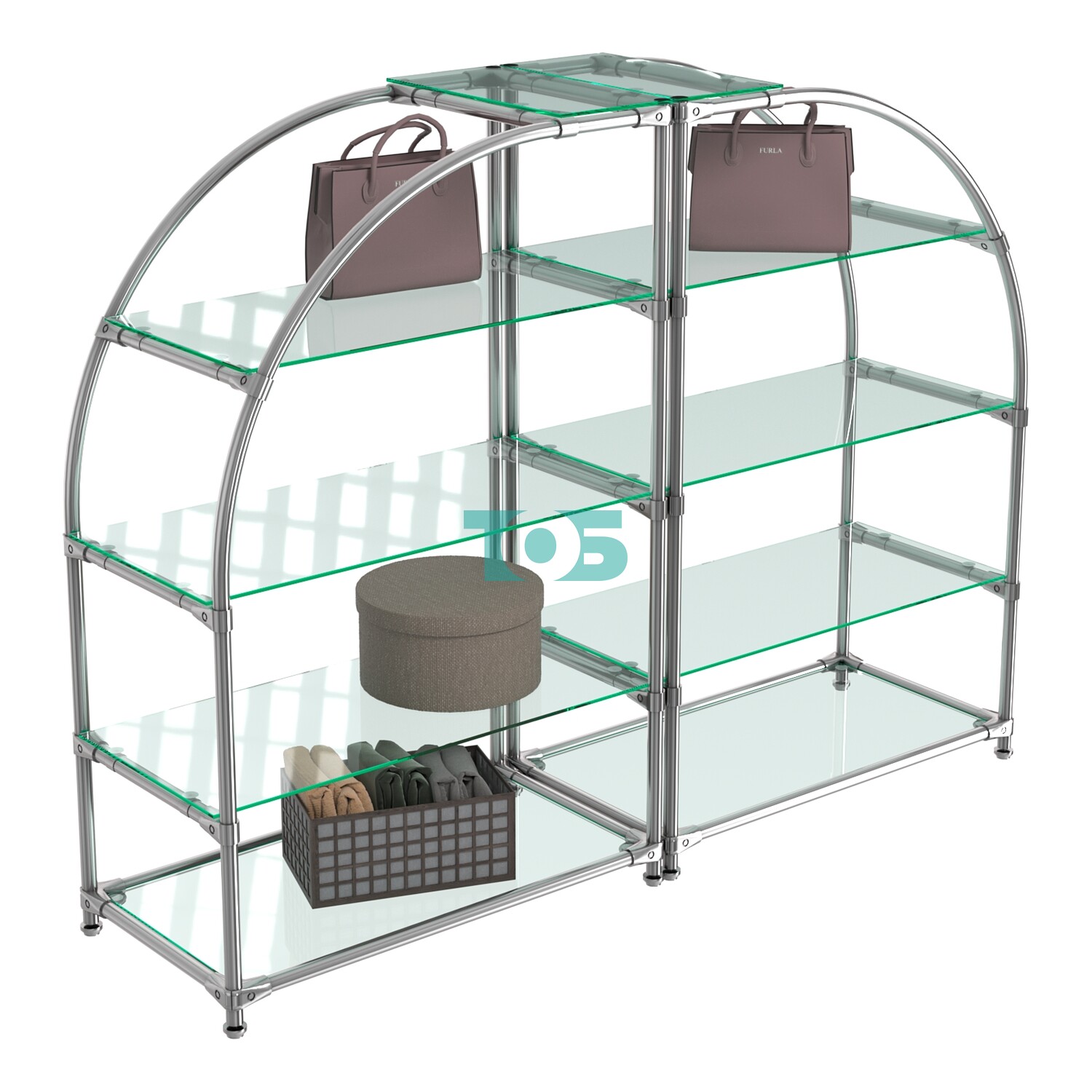 Десять полок из стекла 6 мм: Прочные и прозрачные, они позволяют демонстрировать товары без каких-либо преград, создавая эффект легкости и открытости.