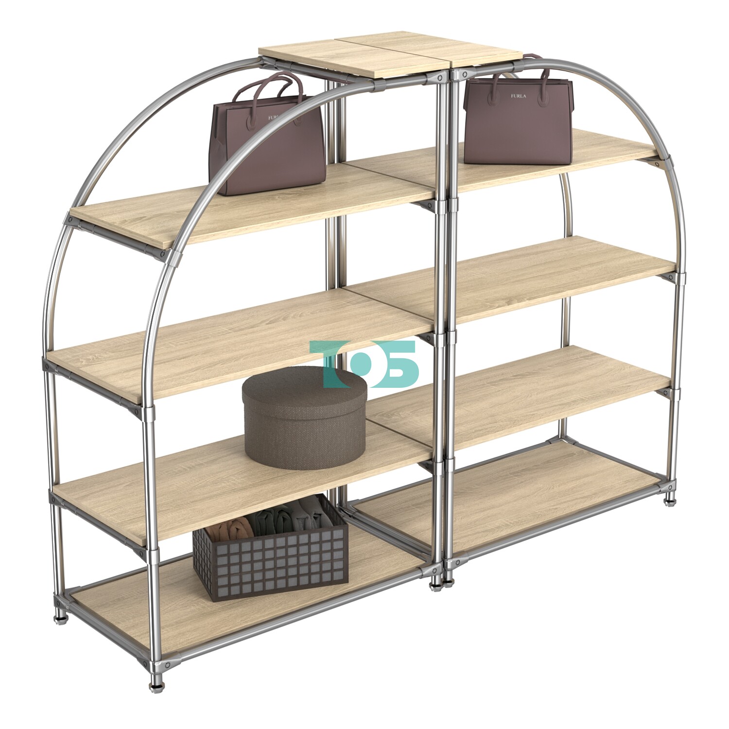 Конструкция островного типа: Позволяет размещать стенды в центре торгового зала, обеспечивая удобный доступ со всех сторон.