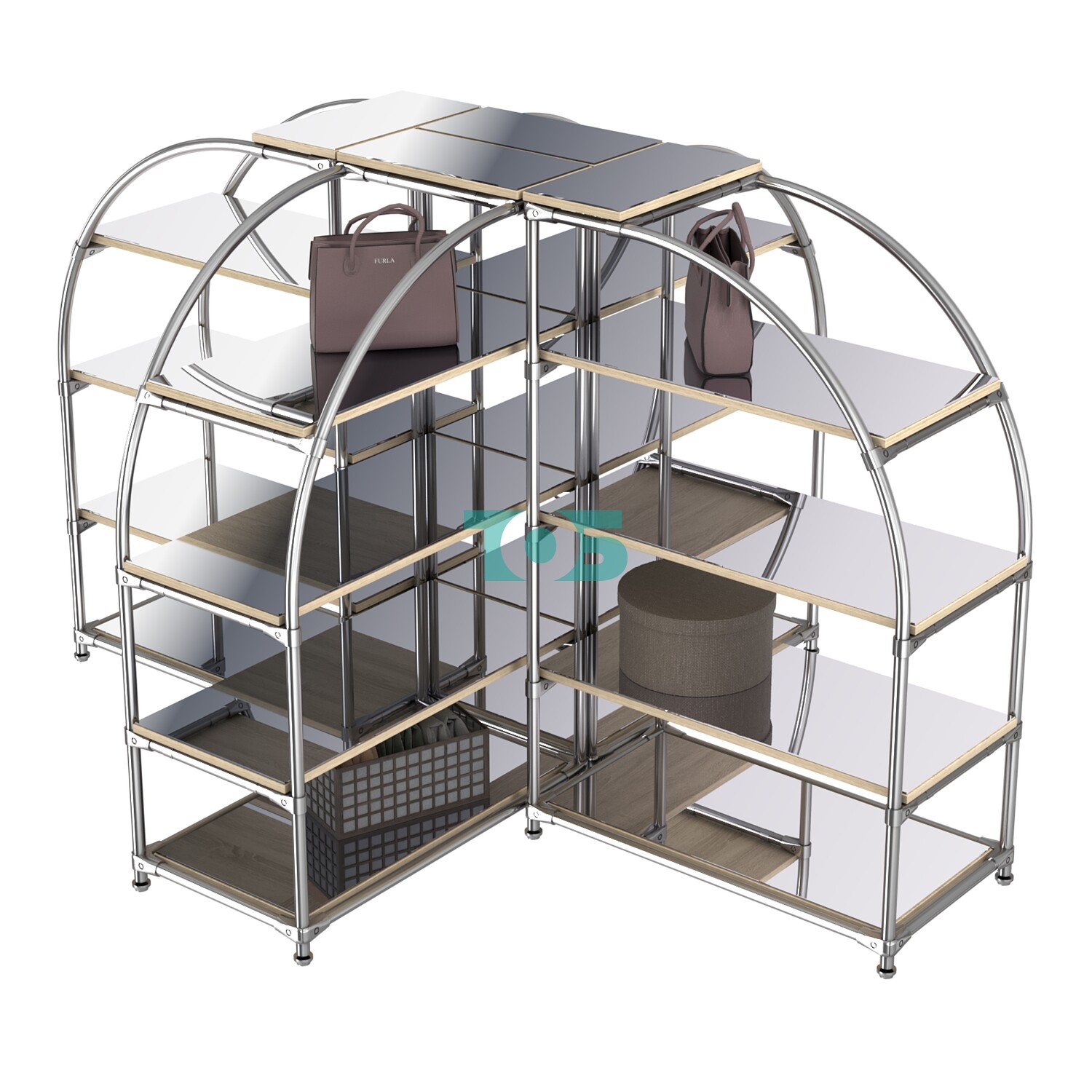 Комбинация стендов TD-06 №3-5 не только функциональна, но и визуально эффектна благодаря сочетанию хромированного каркаса, полок из ДСП и зеркальных поверхностей. Она идеально подходит для магазинов, стремящихся создать яркое и стильное торговое пространство, которое привлекает внимание покупателей и подчеркивает ассортимент товаров.