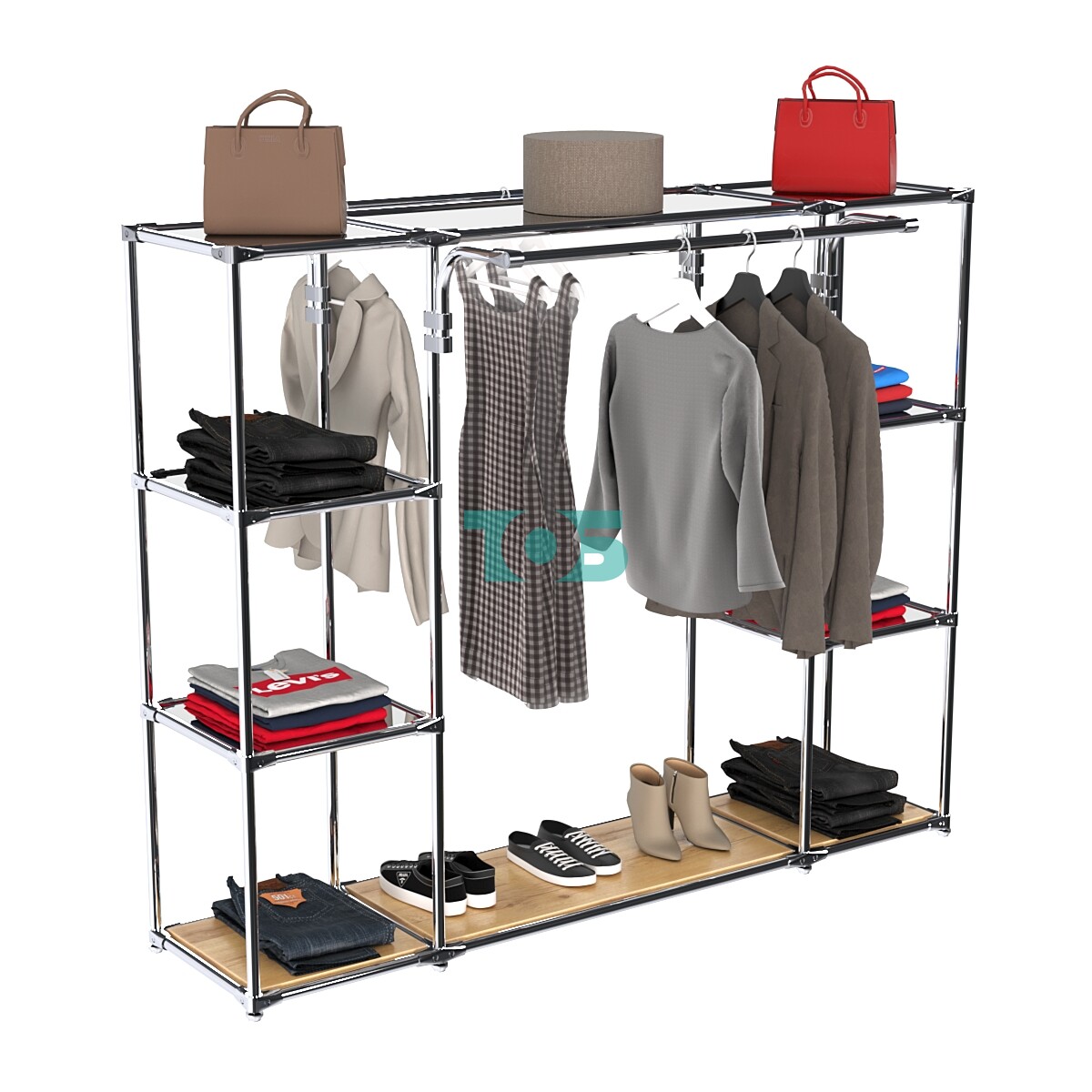 - Два выносных усиленных поручня для тяжелой одежды больших размеров: идеально подходят для демонстрации крупногабаритных предметов гардероба, таких как пальто, куртки и плащи.