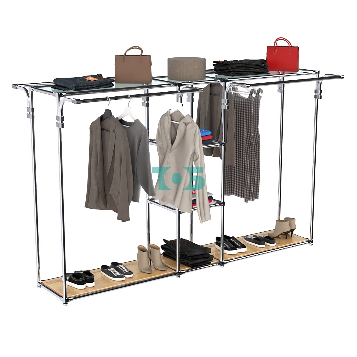 Элегантный хромированный каркас: Прочный и долговечный, он придает стенду роскошный и стильный вид, который привлекает внимание и подчеркивает статус вашего магазина.