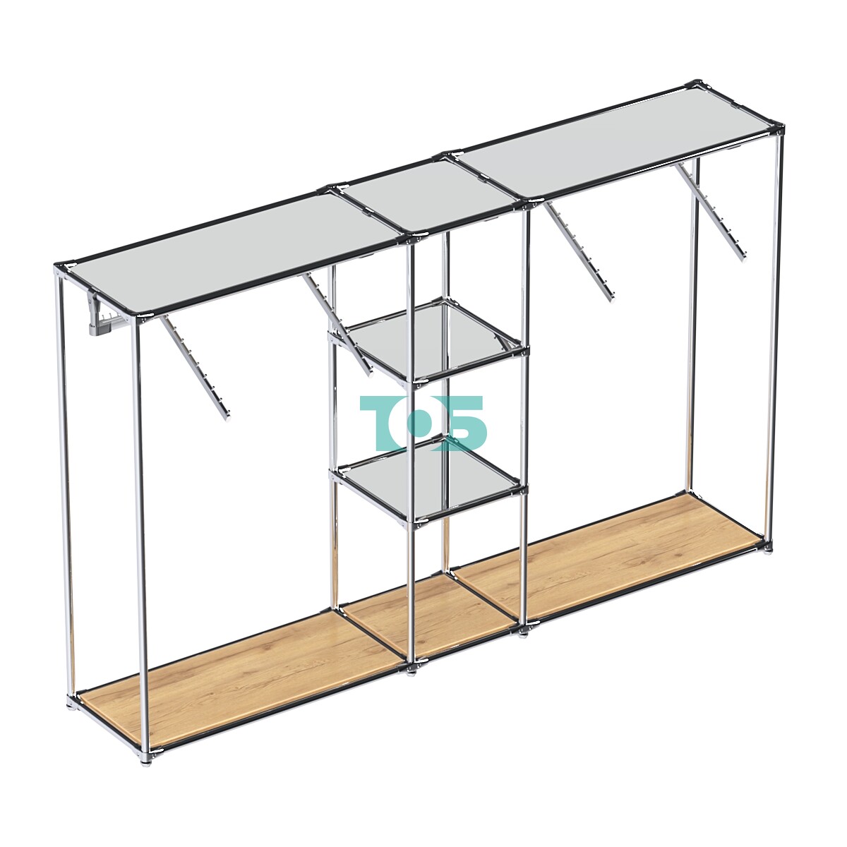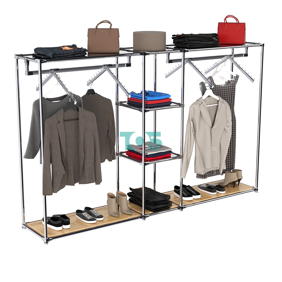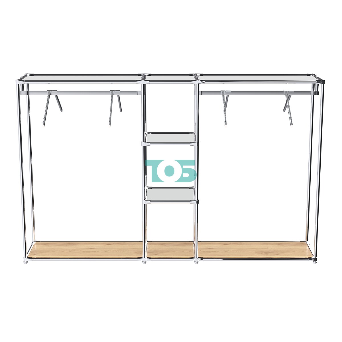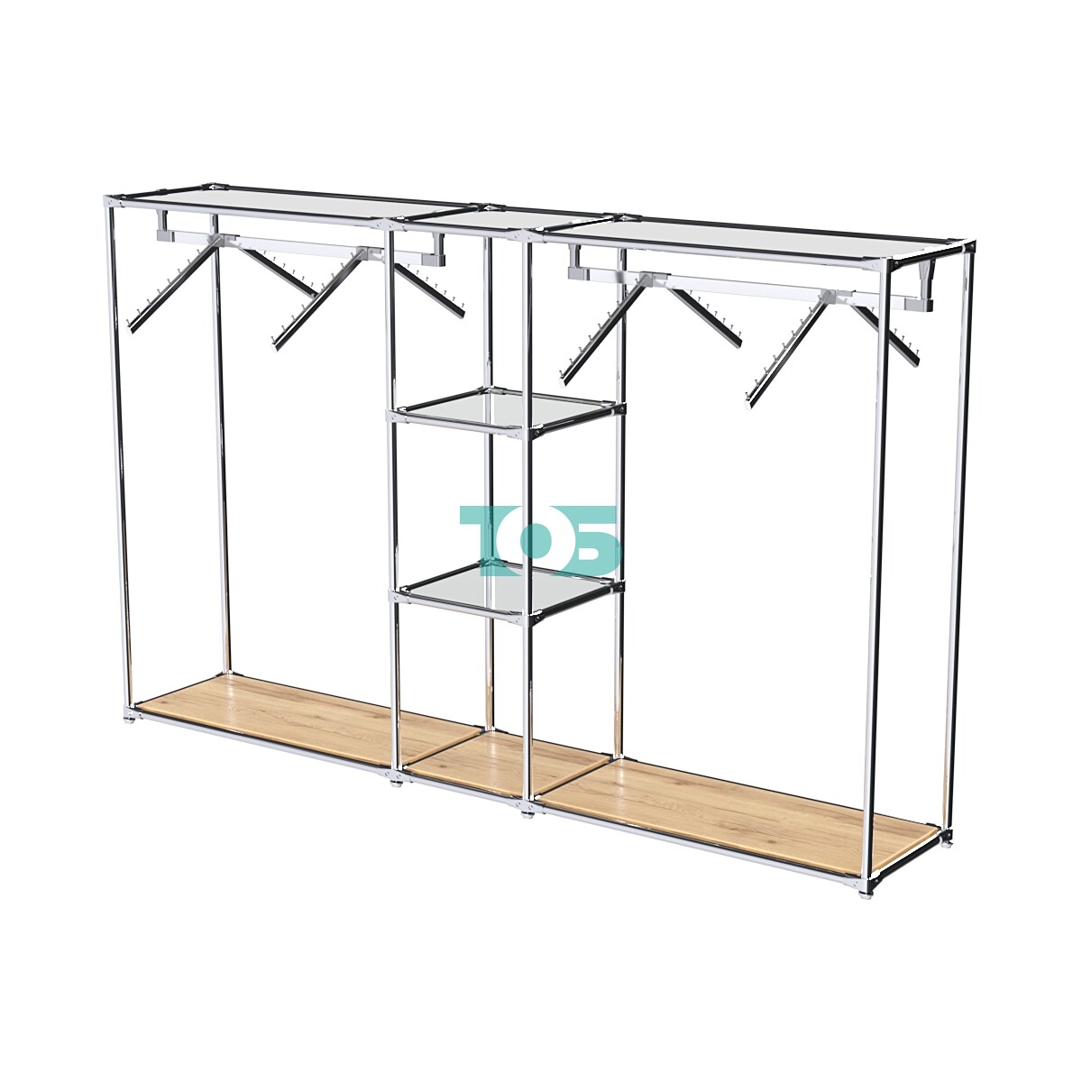 Отсеки с внутренними поручнями: В правой и левой частях конструкции предусмотрены отсеки для выносных кронштейнов с одеждой и фасадной вывеской. Поручни можно регулировать по высоте, что позволяет оптимально использовать пространство.