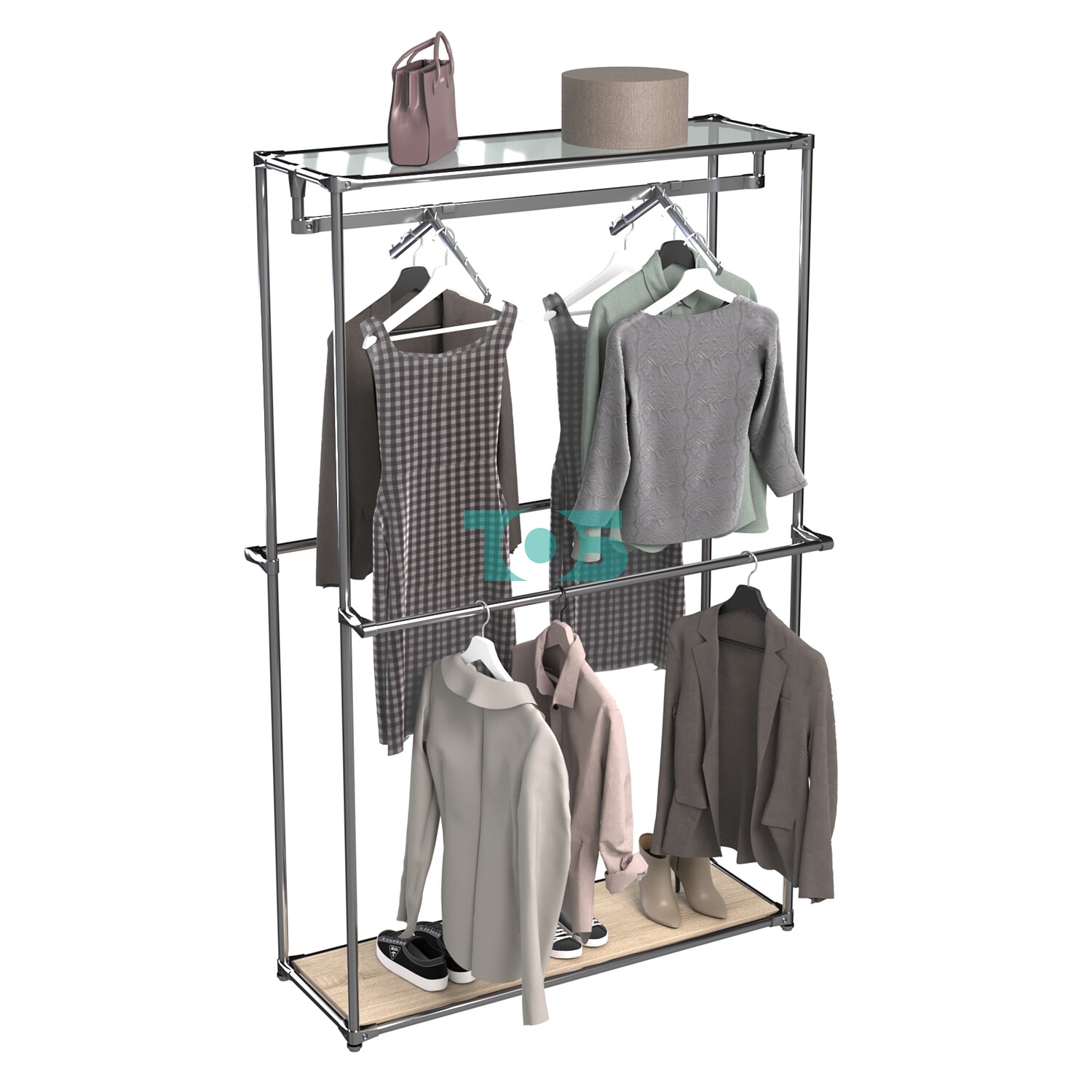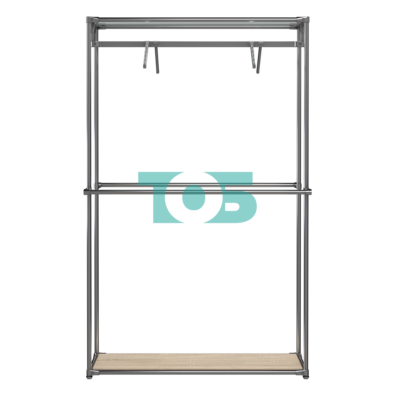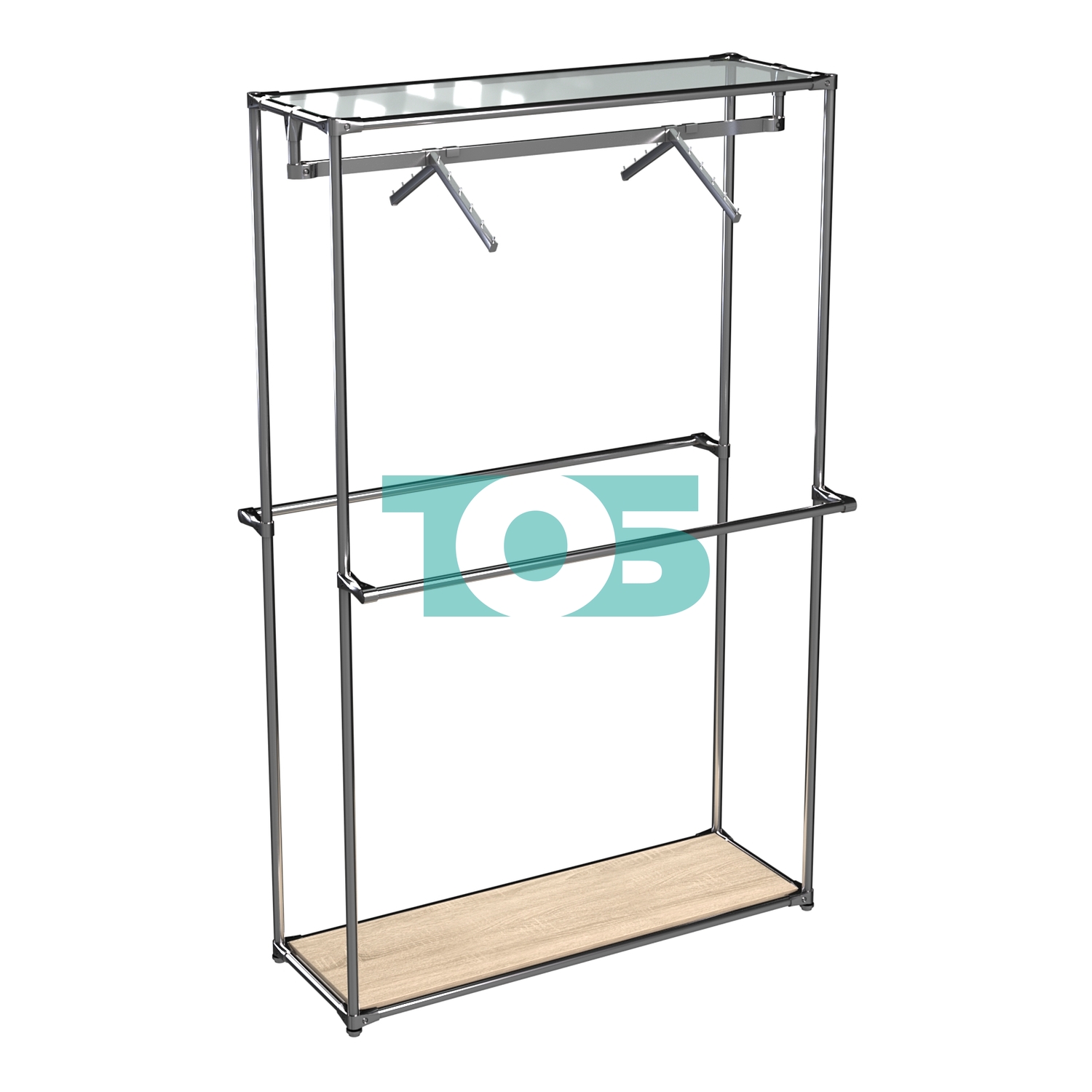 Два внешних поручня: Предназначены для демонстрации одежды, регулируются по высоте, что позволяет оптимально использовать пространство для размещения различных видов одежды.
