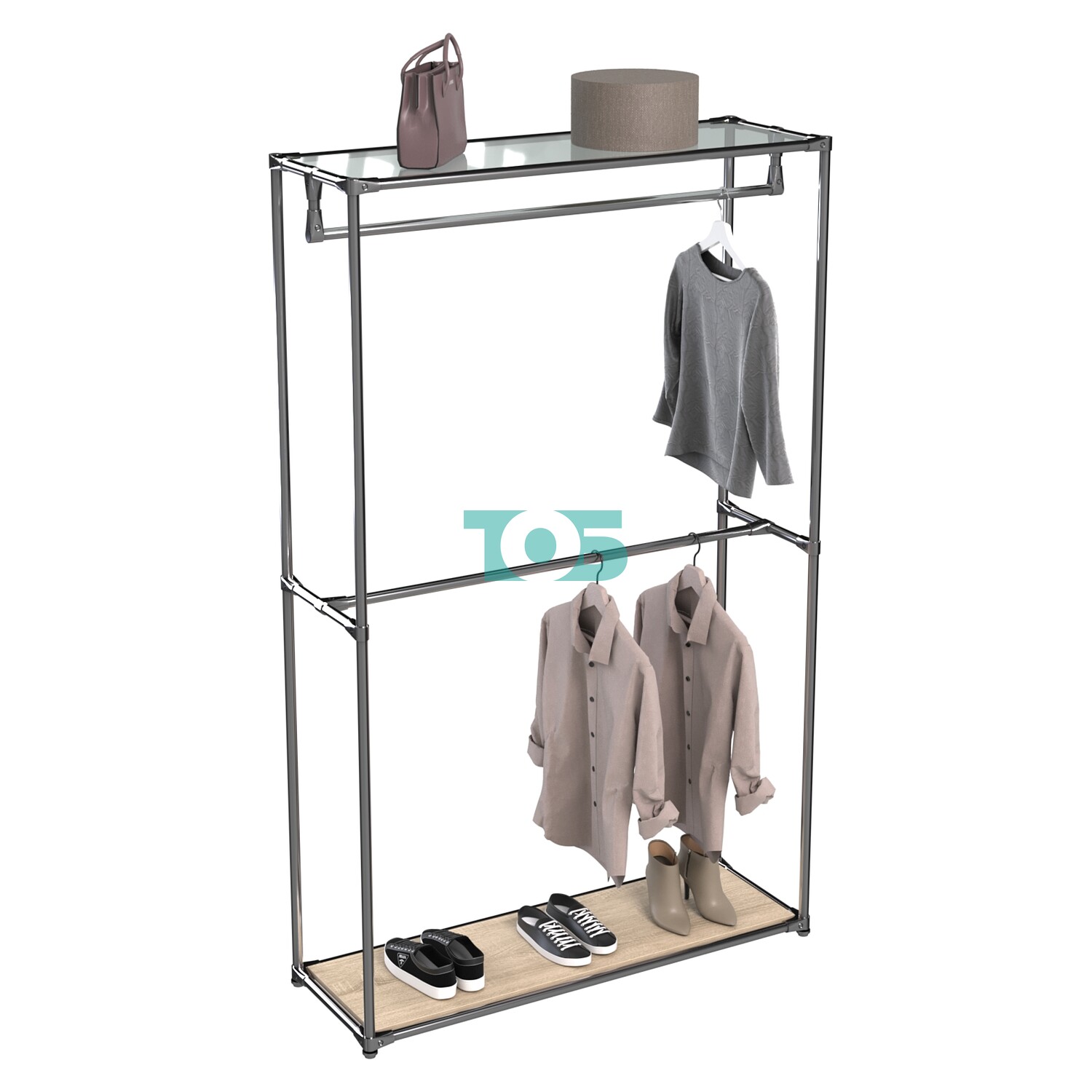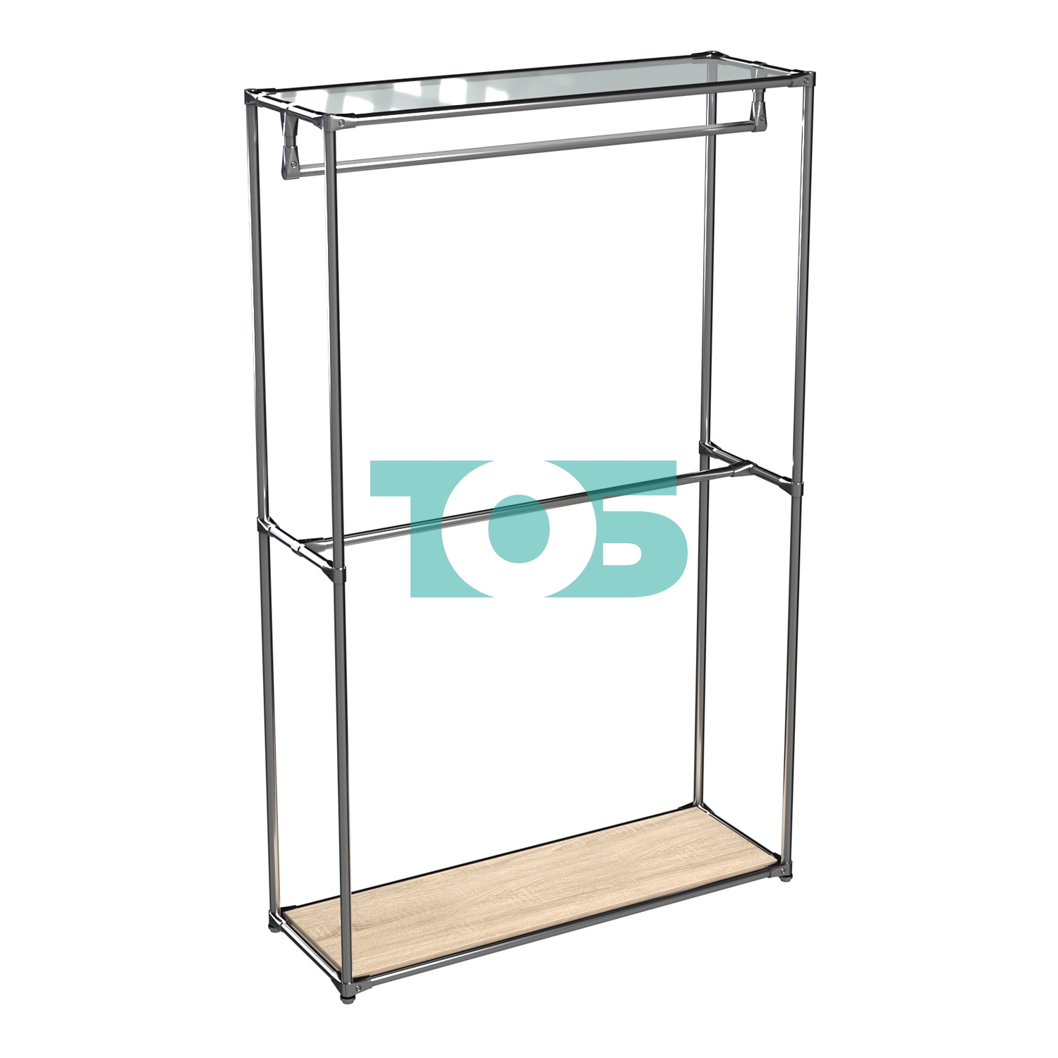 Два внутренних поручня: Предназначены для демонстрации одежды, регулируются по высоте, что позволяет оптимально использовать пространство для размещения различных видов одежды.