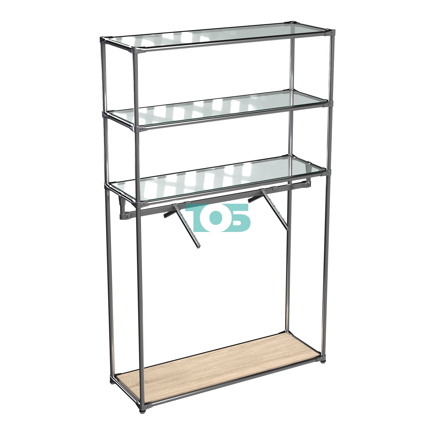 Одна стеклянная полка 6 мм в хромированной обвязке: Придает изделию элегантность и легкость, а также позволяет размещать дополнительные товары, такие как аксессуары или небольшие предметы одежды.