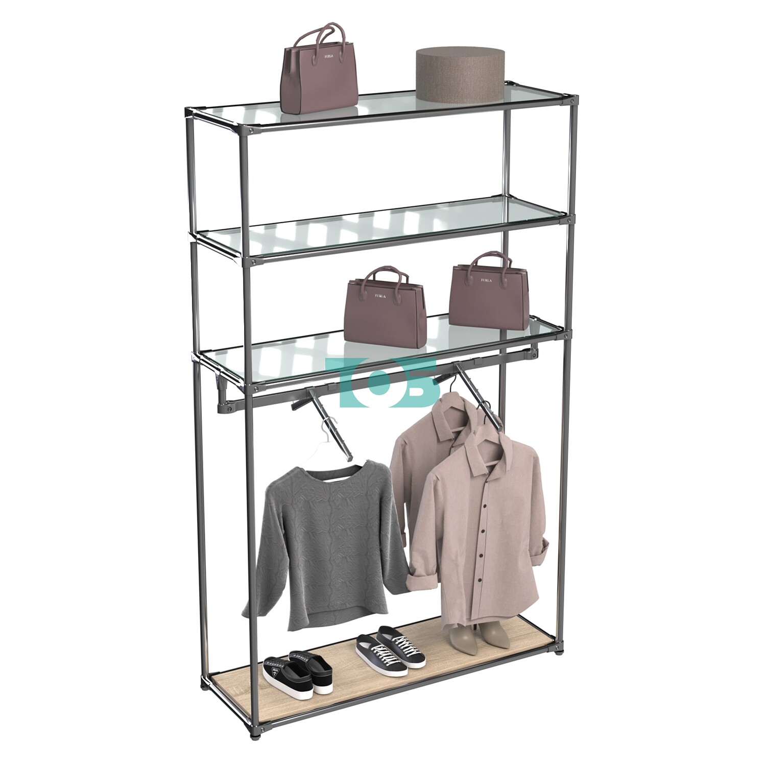 Один внутренний поручень под выносные кронштейны для одежды с фасадной вывеской: Позволяет демонстрировать одежду с использованием крючков или кронштейнов, которые приобретаются отдельно в зависимости от моделей и их размерного ряда. Это дает возможность гибко подходить к выкладке товара.