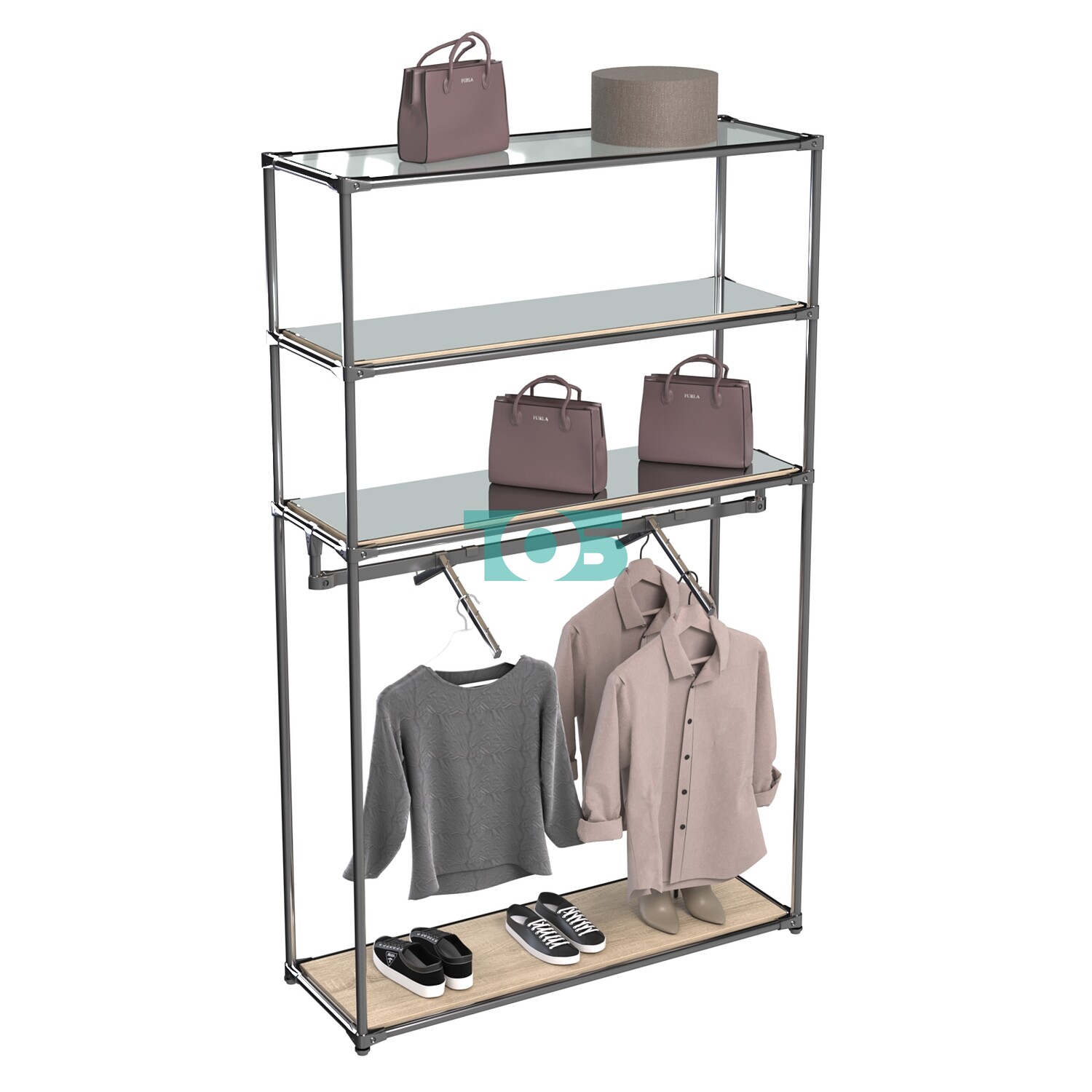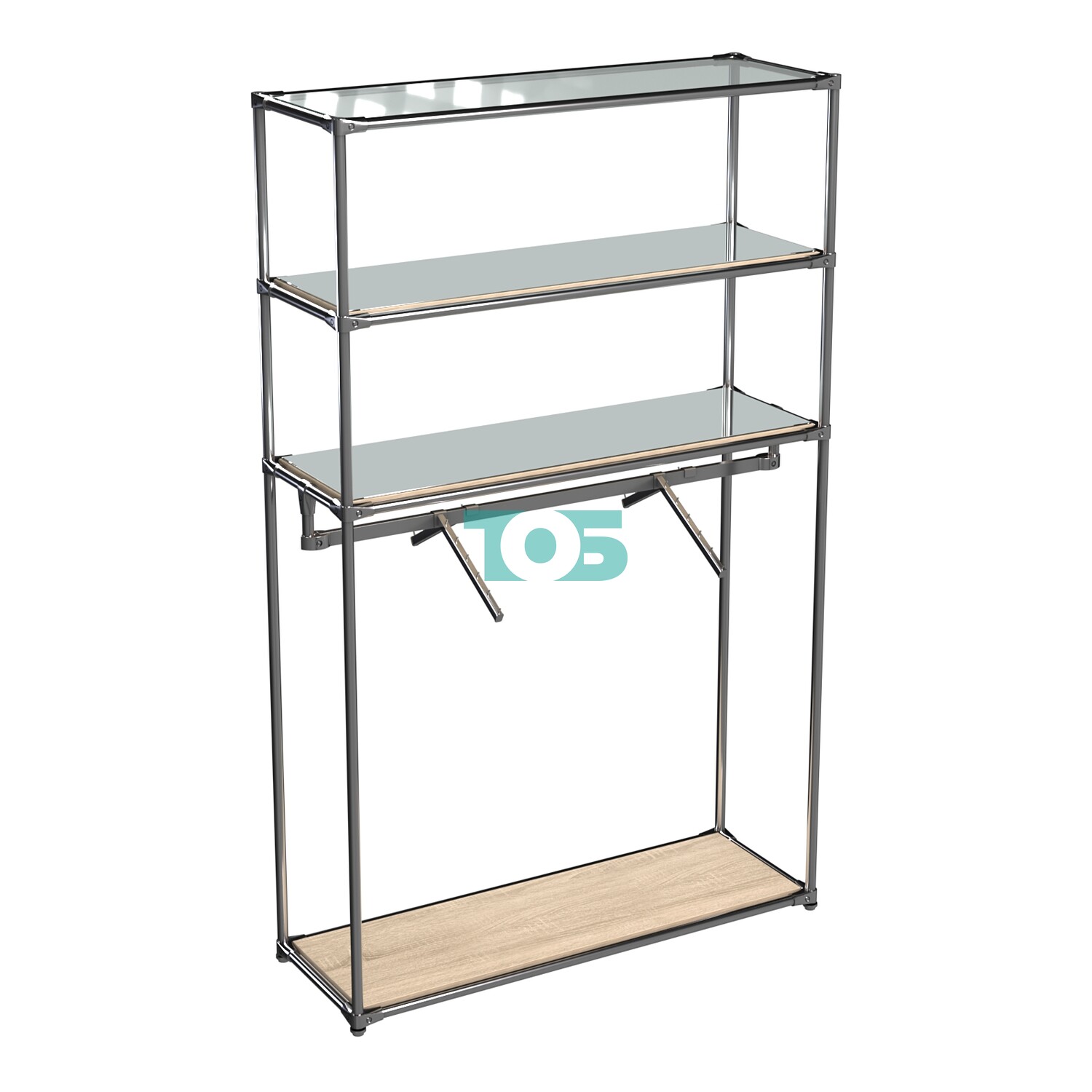 Один внутренний поручень под выносные кронштейны для одежды с фасадной вывеской: Позволяет демонстрировать одежду с использованием крючков или кронштейнов, которые приобретаются отдельно в зависимости от моделей и их размерного ряда. Это дает возможность гибко подходить к выкладке товара.