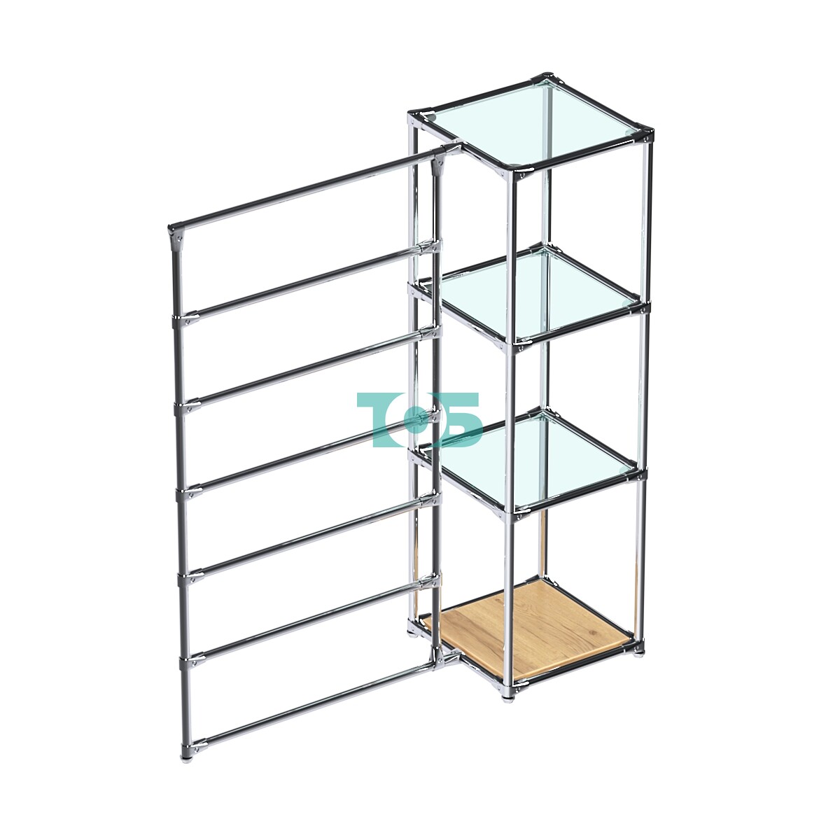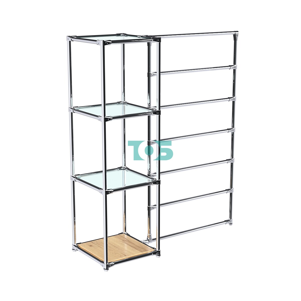 Семь круглых хромированных труб в левом крыле: Предназначены для демонстрации товаров, регулируются по высоте и могут быть добавлены или убраны по необходимости.