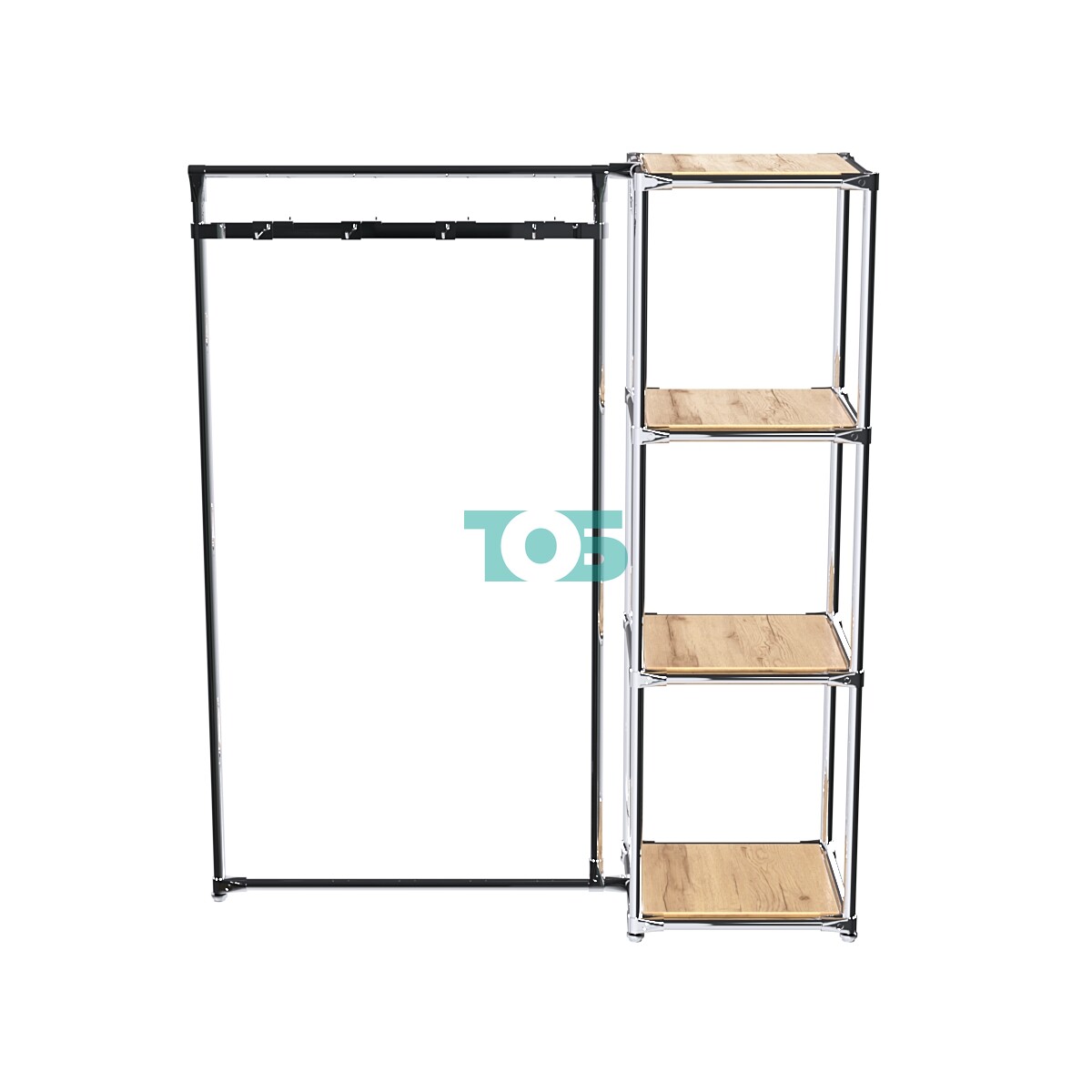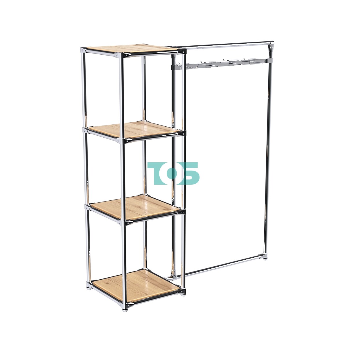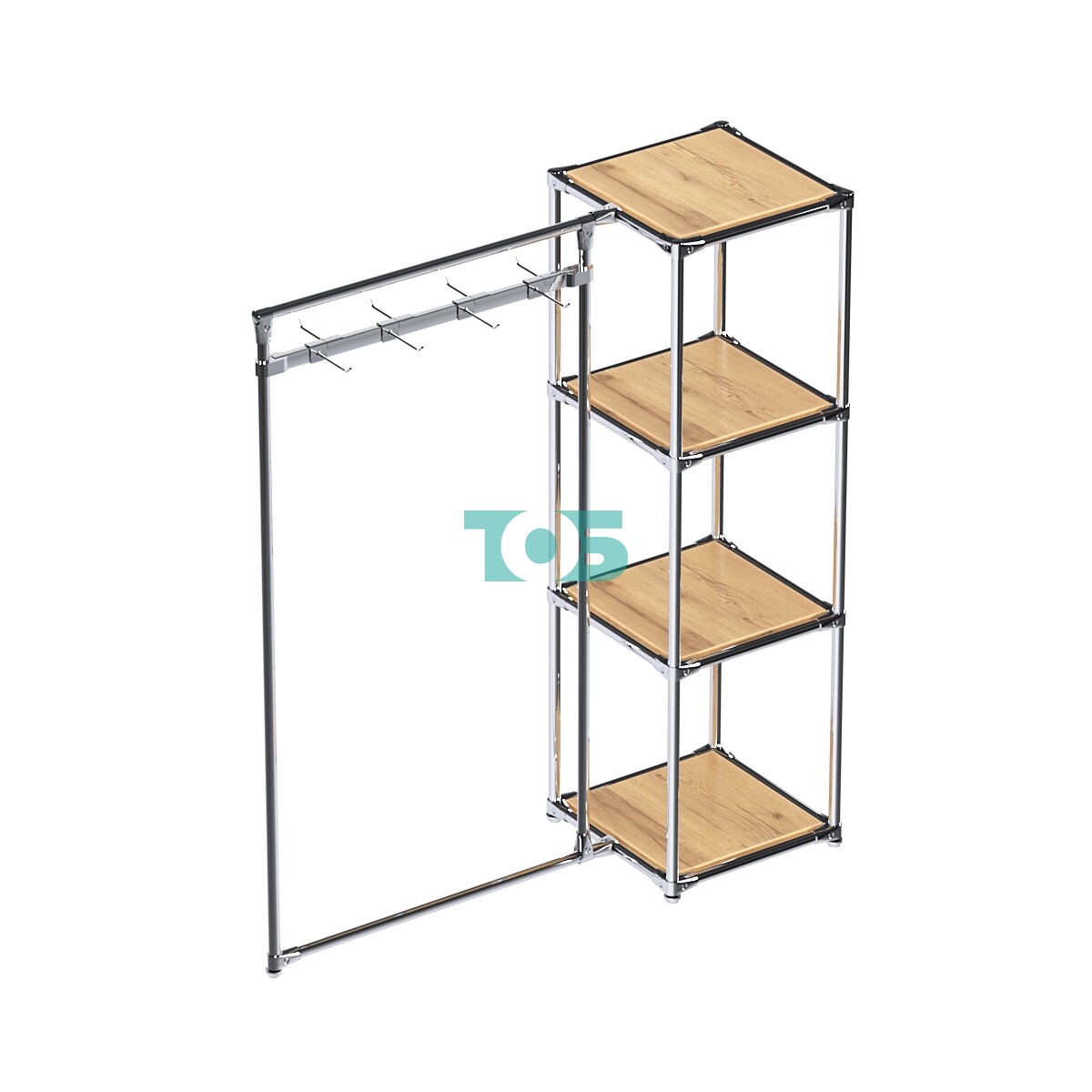 Прямоугольная хромированная штанга в левом крыле: Идеальна для крючков или кронштейнов на квадратную трубу, при этом штангу можно регулировать по высоте в зависимости от габаритов товара, а также добавлять или убирать дополнительные элементы.