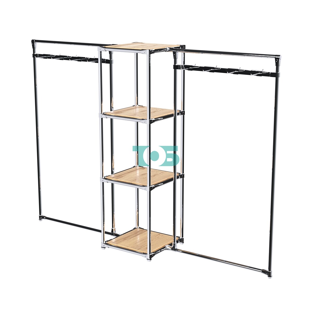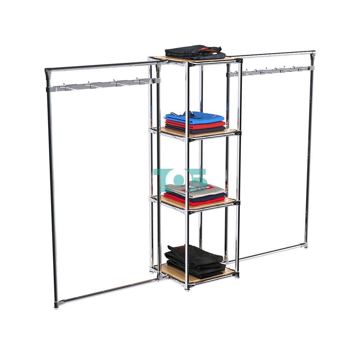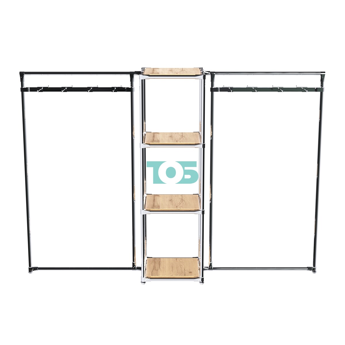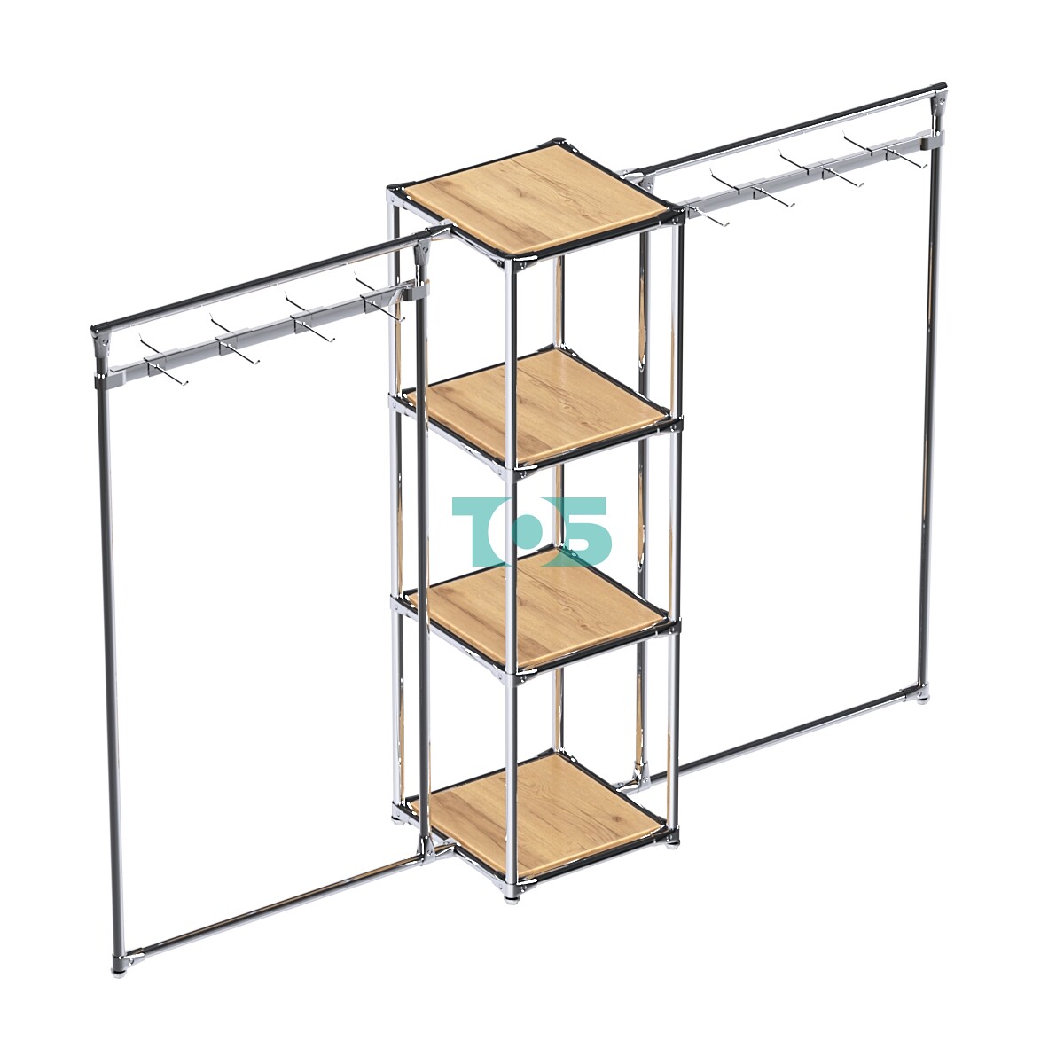 Прямоугольные хромированные штанги в левом и правом крыле: Идеальны для крючков или кронштейнов на квадратную трубу, при этом штанги можно регулировать по высоте в зависимости от габаритов товара, а также добавлять или убирать дополнительные элементы.