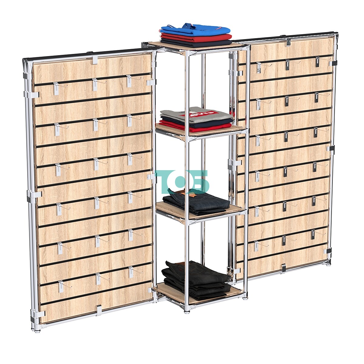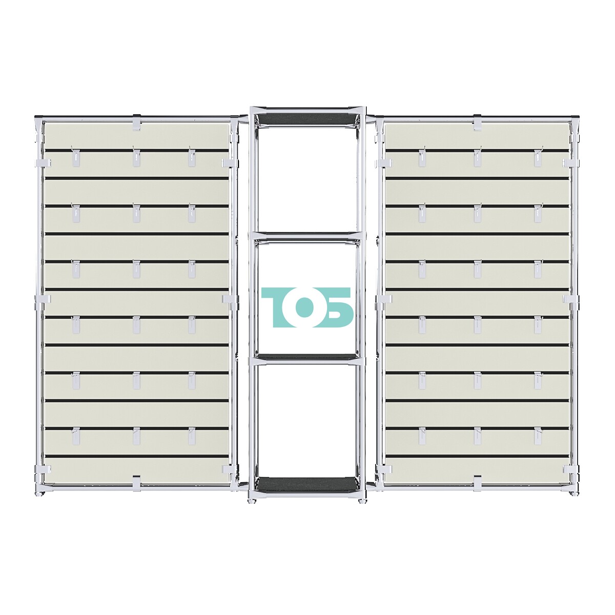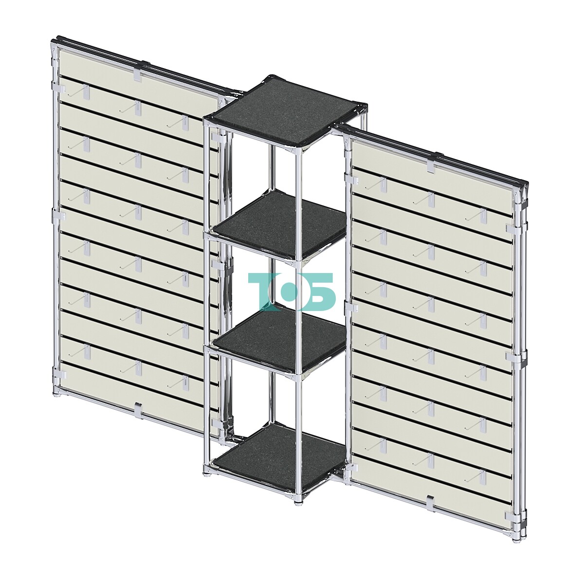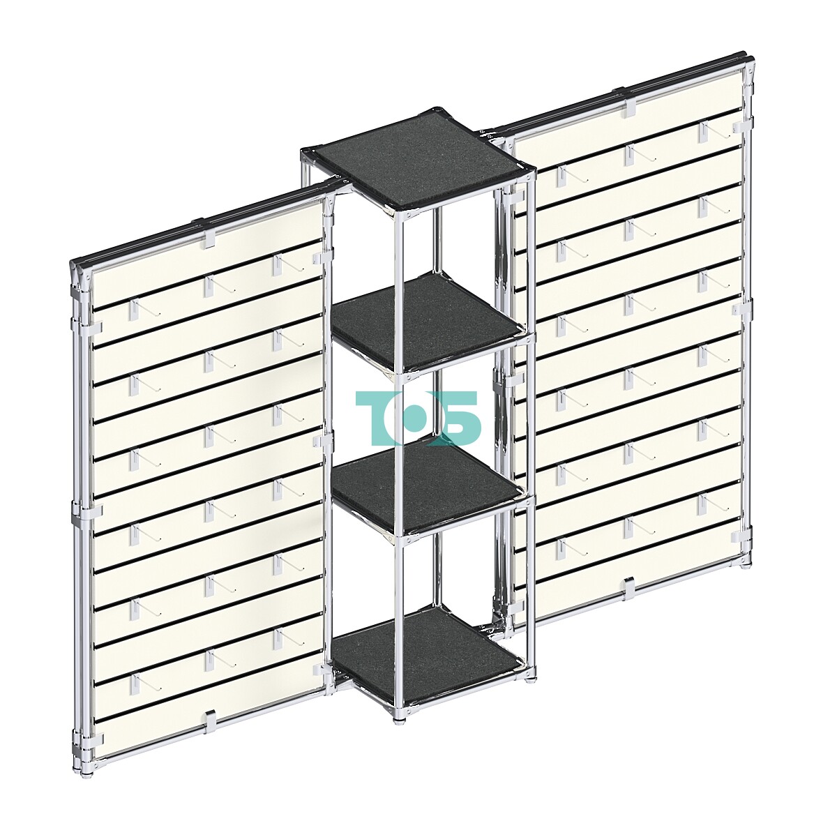 Экономпанели: В левом и правом крыле конструкции расположены двусторонние экономпанели, на которые можно крепить крючки, кронштейны или корзины, расширяя функциональность вешала.