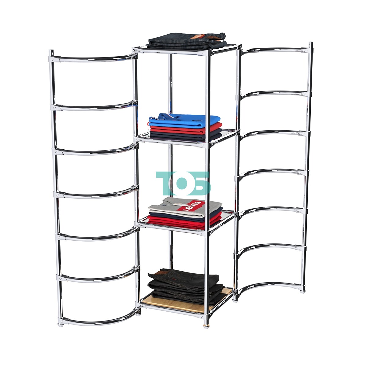 Хромированные штанги с дугами: Размещены в правом и левом крыле конструкции, каждая штанга состоит из семи дуг. Дуги можно регулировать по высоте в зависимости от габаритов товаров. Также возможно добавление дополнительных штанг для большего удобства.