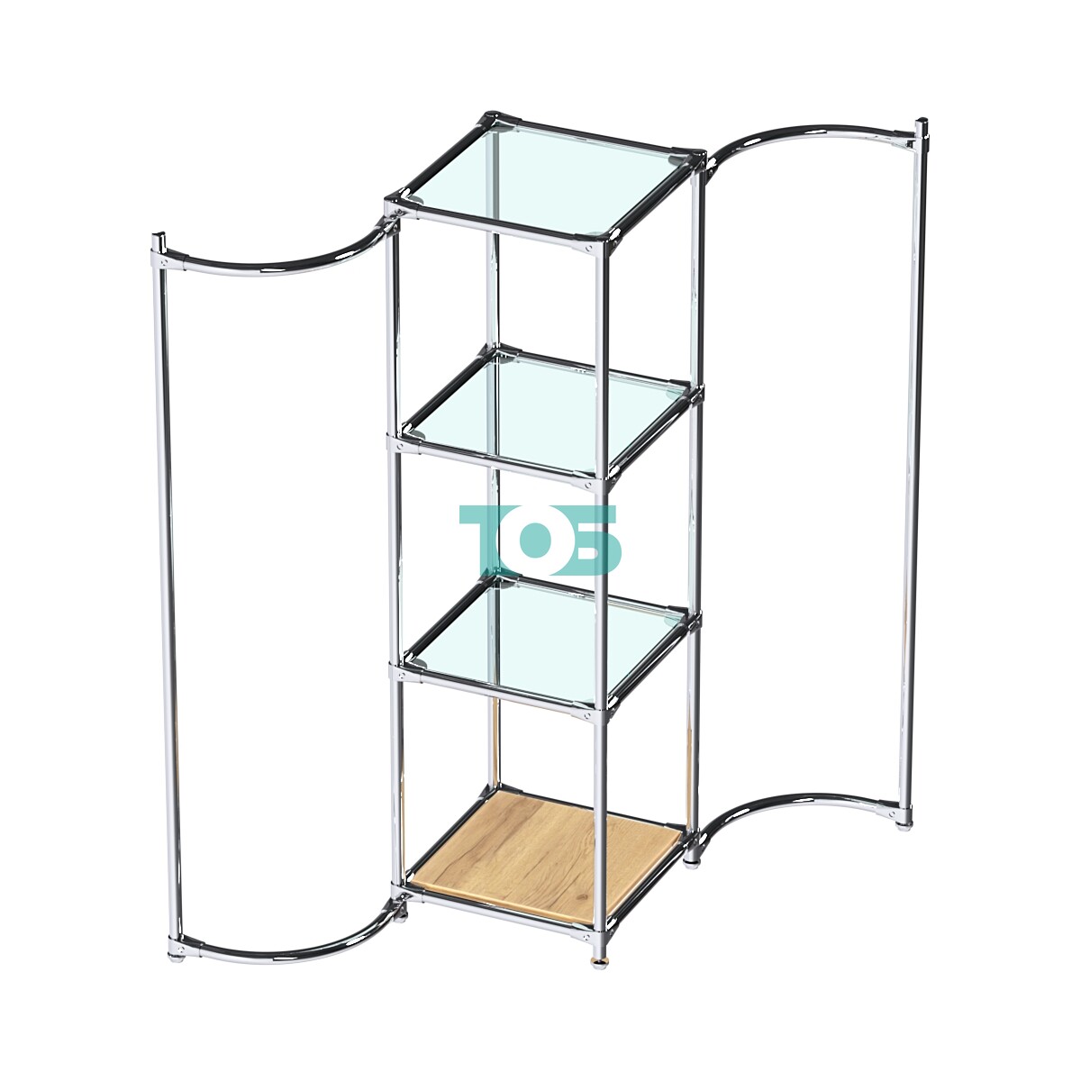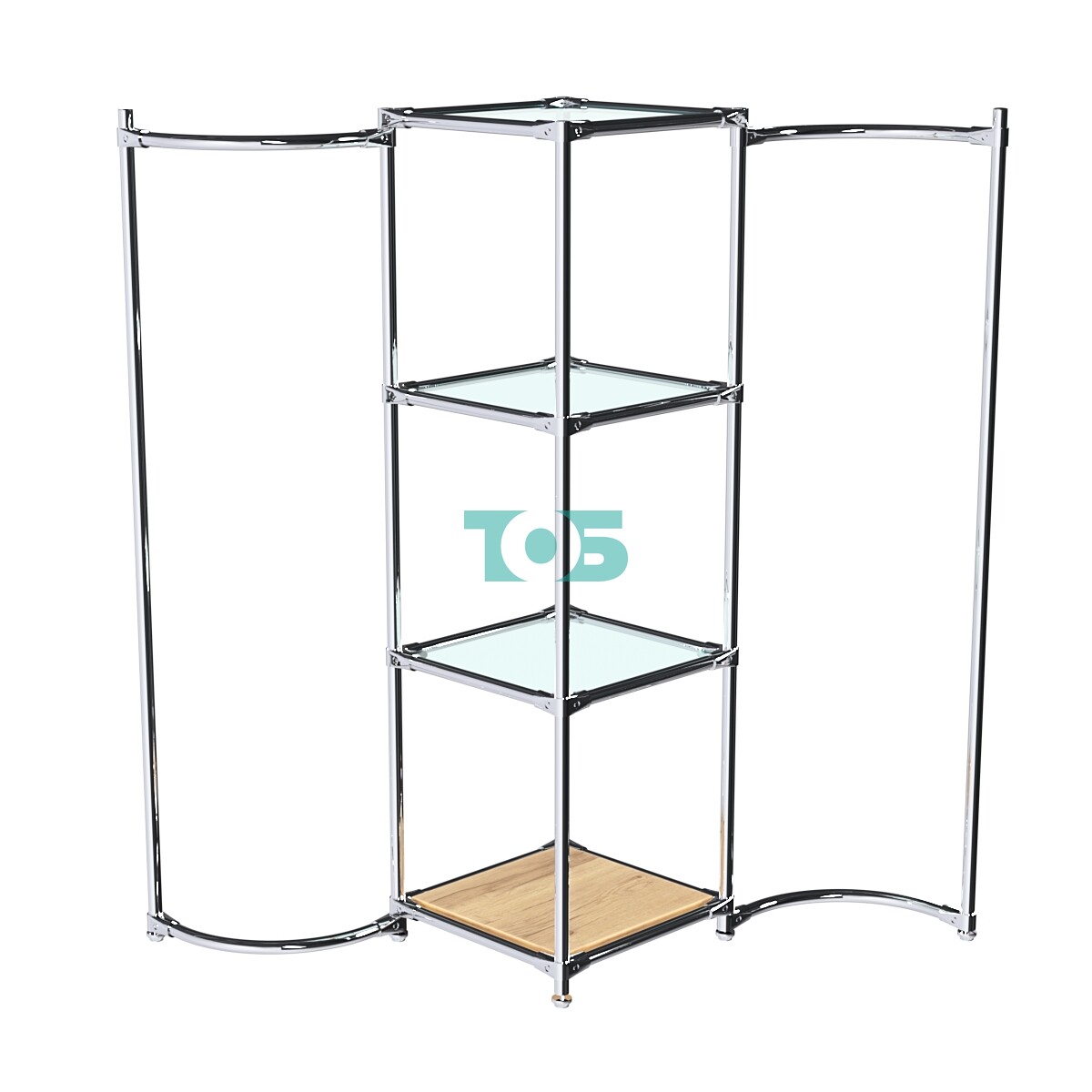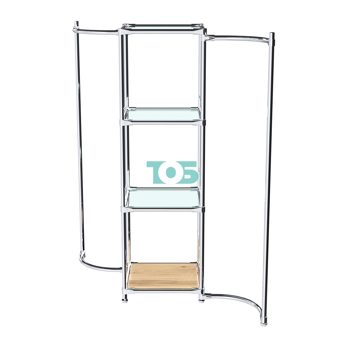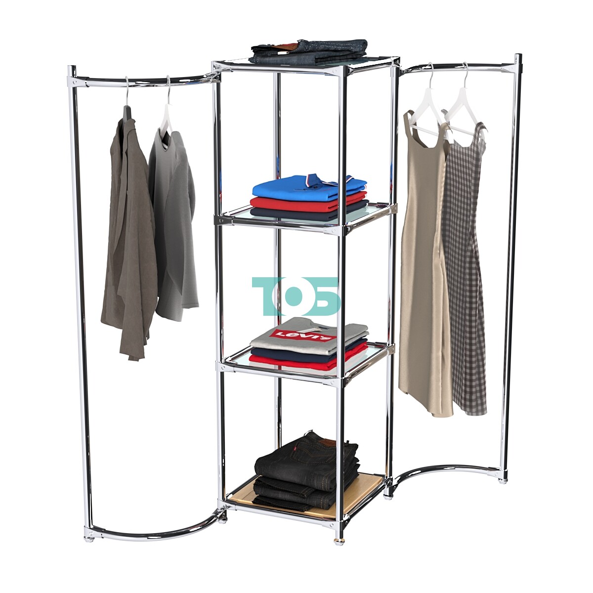 Дугообразные хромированные штанги для плечиков: Расположены в правом и левом крыле конструкции, обеспечивают удобное размещение одежды на плечиках.