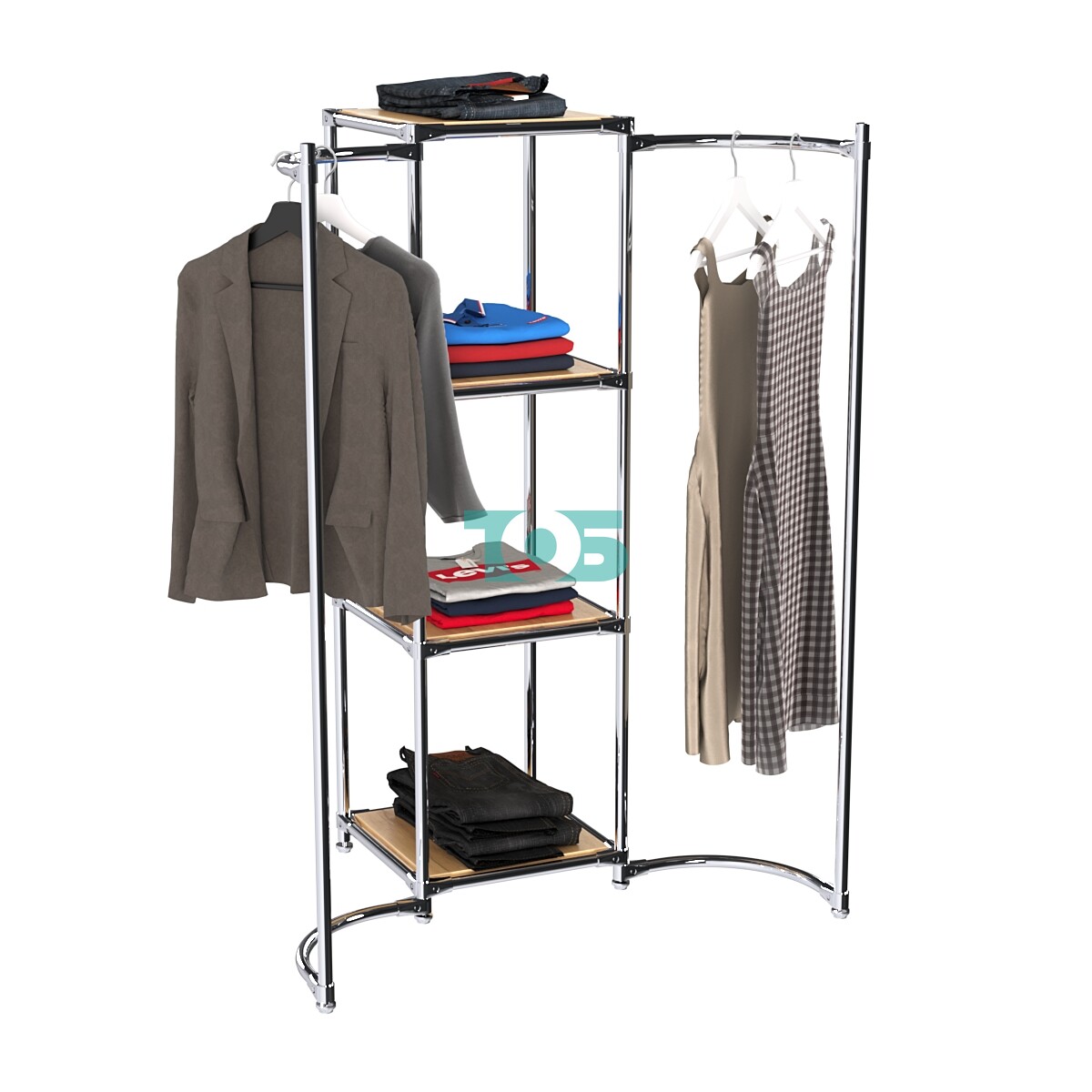 Дугообразные хромированные штанги для плечиков с фасада конструкции: Обеспечивают удобное размещение одежды на плечиках и позволяют демонстрировать товар с фронтальной стороны.