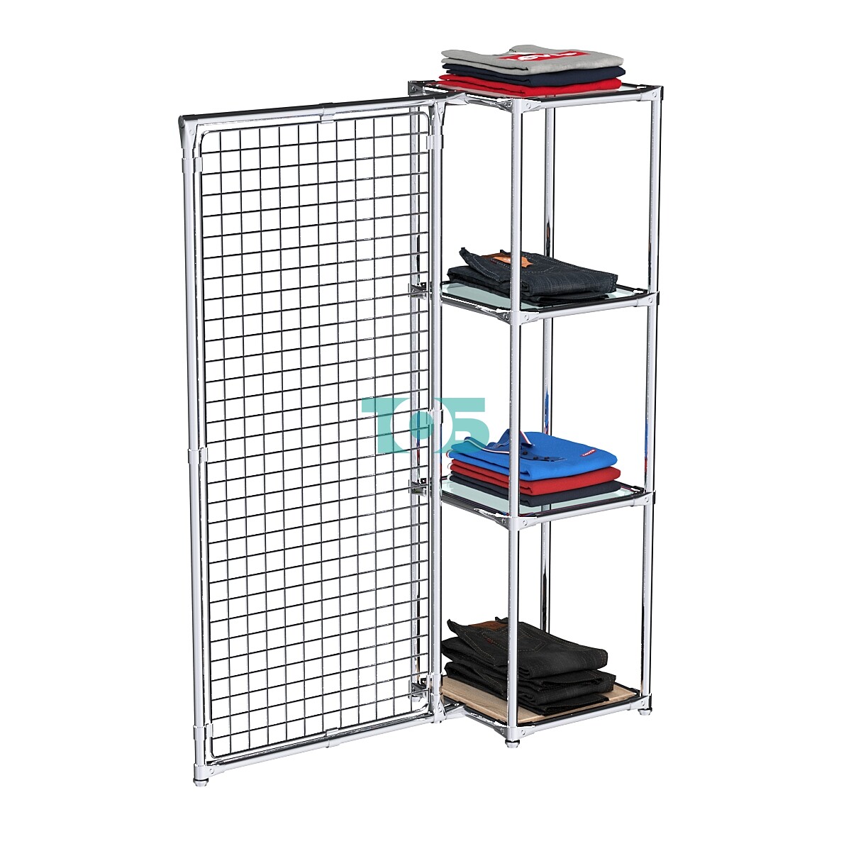 Хромированная решетка: В левом крыле конструкции расположена хромированная решетка, на которую можно крепить крючки, кронштейны или корзины, расширяя функциональность вешала.
