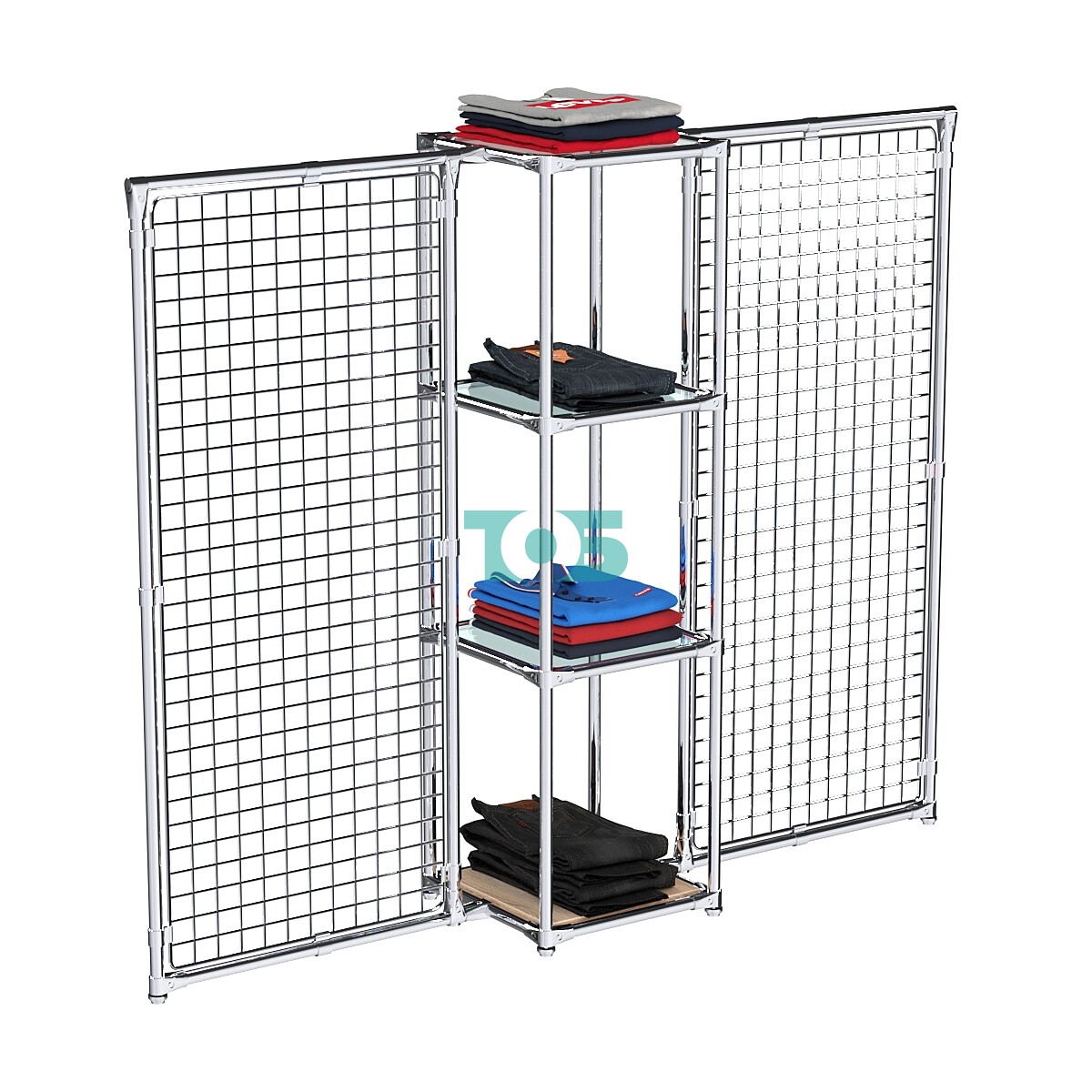Хромированные решетки: В левом и правом крыле конструкции расположены хромированные решетки, на которые можно крепить крючки, кронштейны или корзины, расширяя функциональность вешала.