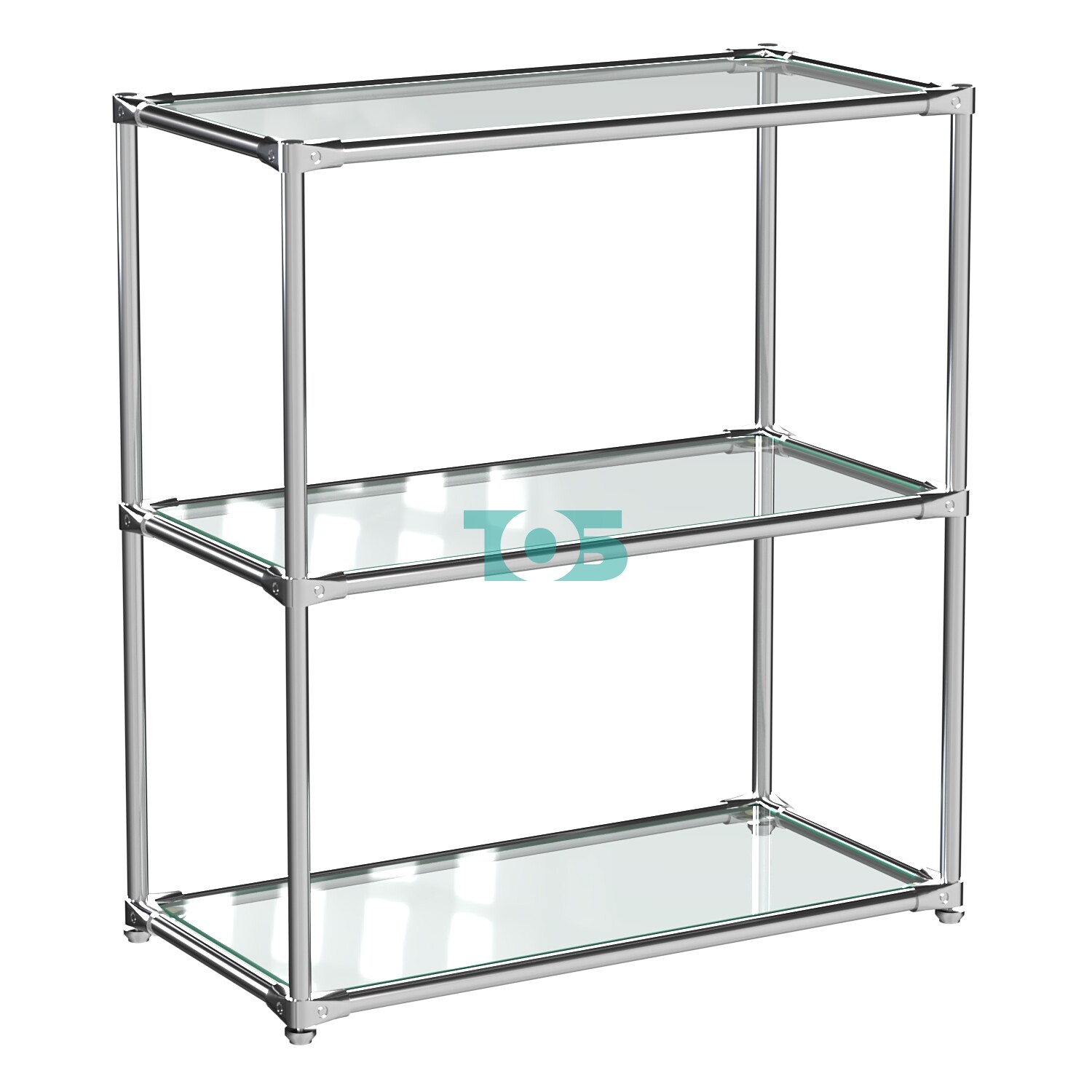 Эстетика: Хромированный каркас в сочетании с прозрачными стеклянными полками создают современный и элегантный вид, который гармонично впишется в любой интерьер. Прозрачное стекло обеспечивает хороший обзор хранимых предметов.