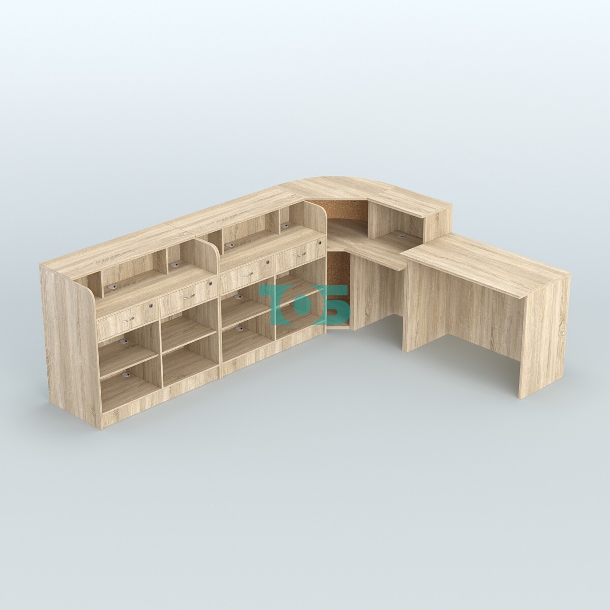 - состоит из двух ресепшенов Лайт, двух стеклянных надставок с каркасом из профиля для кондитерских изделий, секторного ресепшена, прямоугольного ресепшена с надставкой из ДСП и ресепшена под выдачу товара.