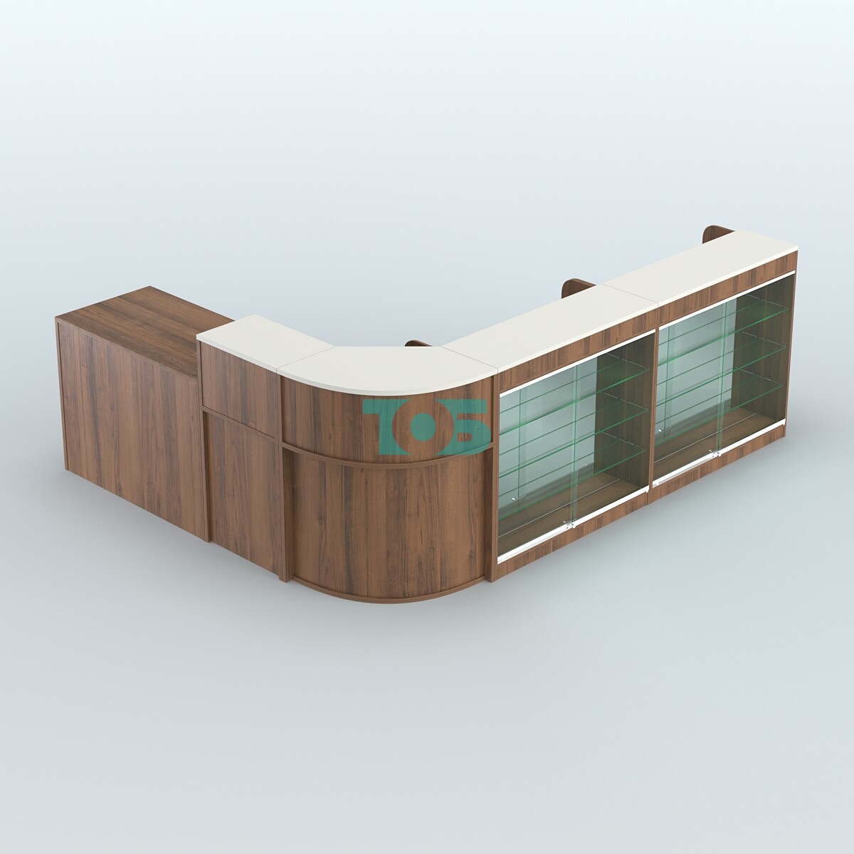 - фасад прямоугольного ресепшена представляет из себя витрину с тремя стеклянными полками и зеркальной задней стенкой. Верхний фриз витрины укомплектован тремя светильниками, которые освещают Товар на полках. Лицевая часть витрины защищена раздвижными стеклянными шторками на мини роликовых направляющих (аналог шкафа-купе) и закрывается на врезной замок. Со стороны продавца предусмотрены два выдвижных ящика с замком и ниша с полкой, куда удобно складировать коробки с товаром и пр;