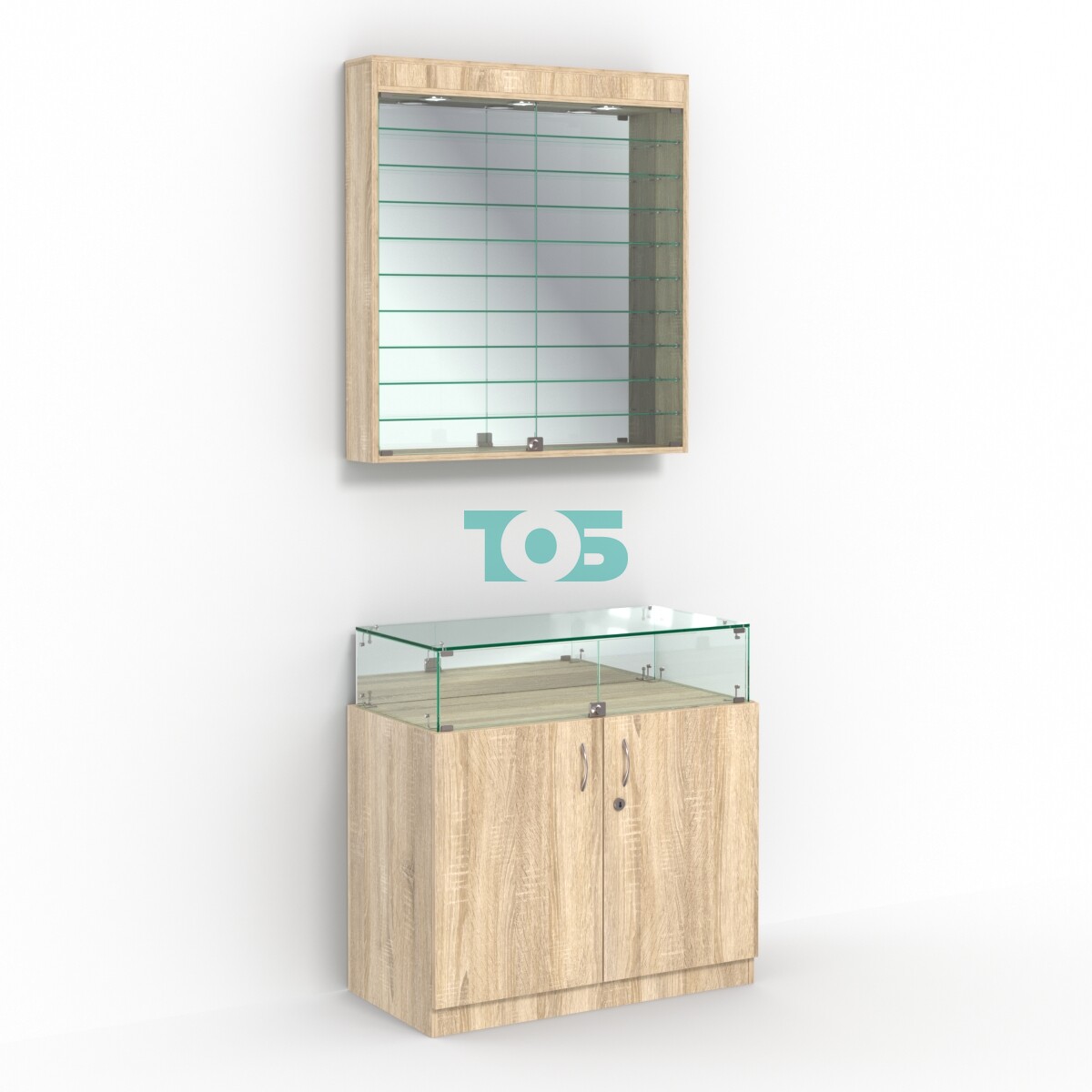 - комплект включает настенную витрину и прилавок со стеклянным верхом;