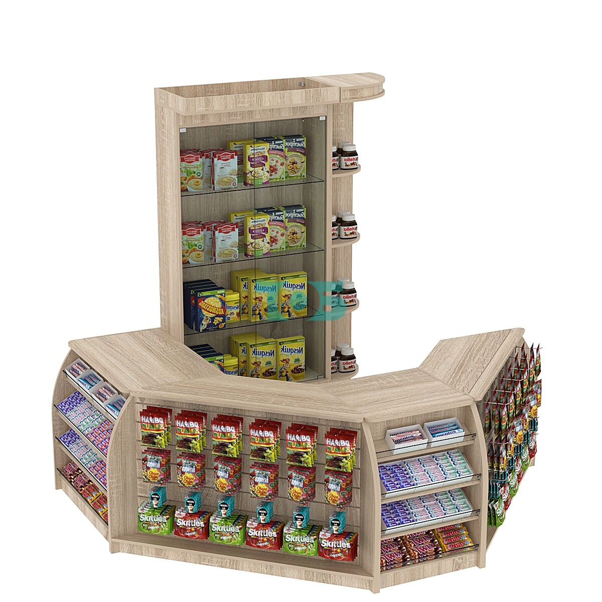 - в состав комплекта кассовой зоны с витринами и скошенным фасадом малый №1-1: