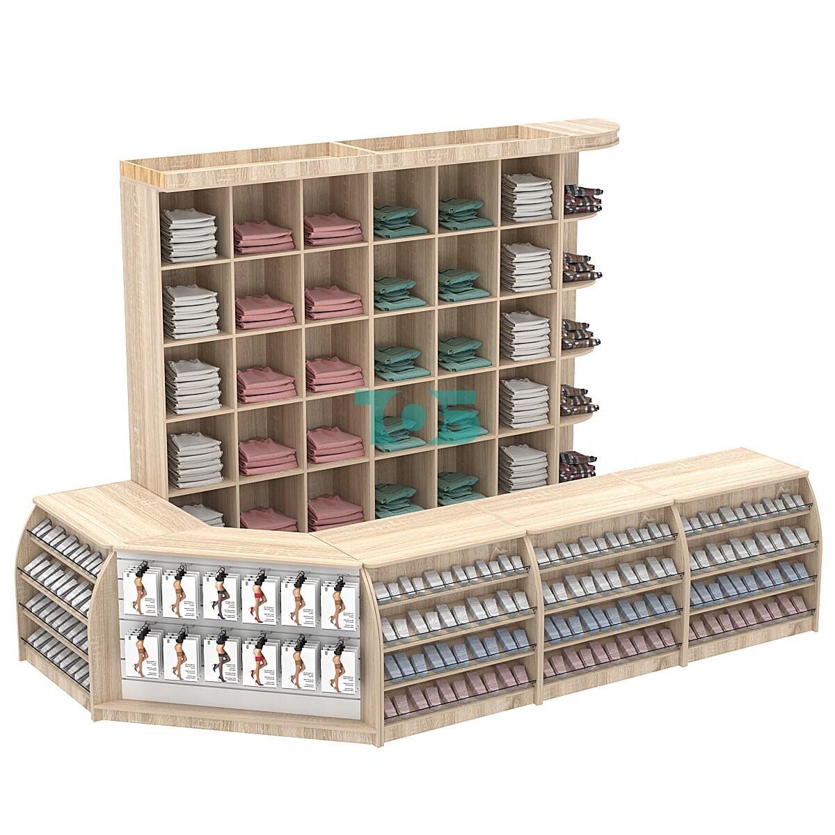 - каждый торговый модуль оборудования максимально функционален и предоставляет для продавца как закрытую зону выкладки товара, которая находится за спиной у продавца, так и зону открытого доступа для Покупателя, расположенную на фасаде прилавков, и обеспечивающую дополнительный объем продаж импульсными покупками;