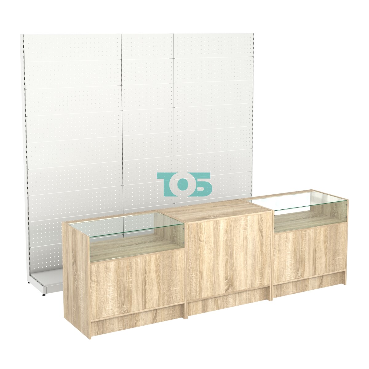 Задняя перфорированная стенка под крючки позволяет удобно размещать дополнительные аксессуары или товары.