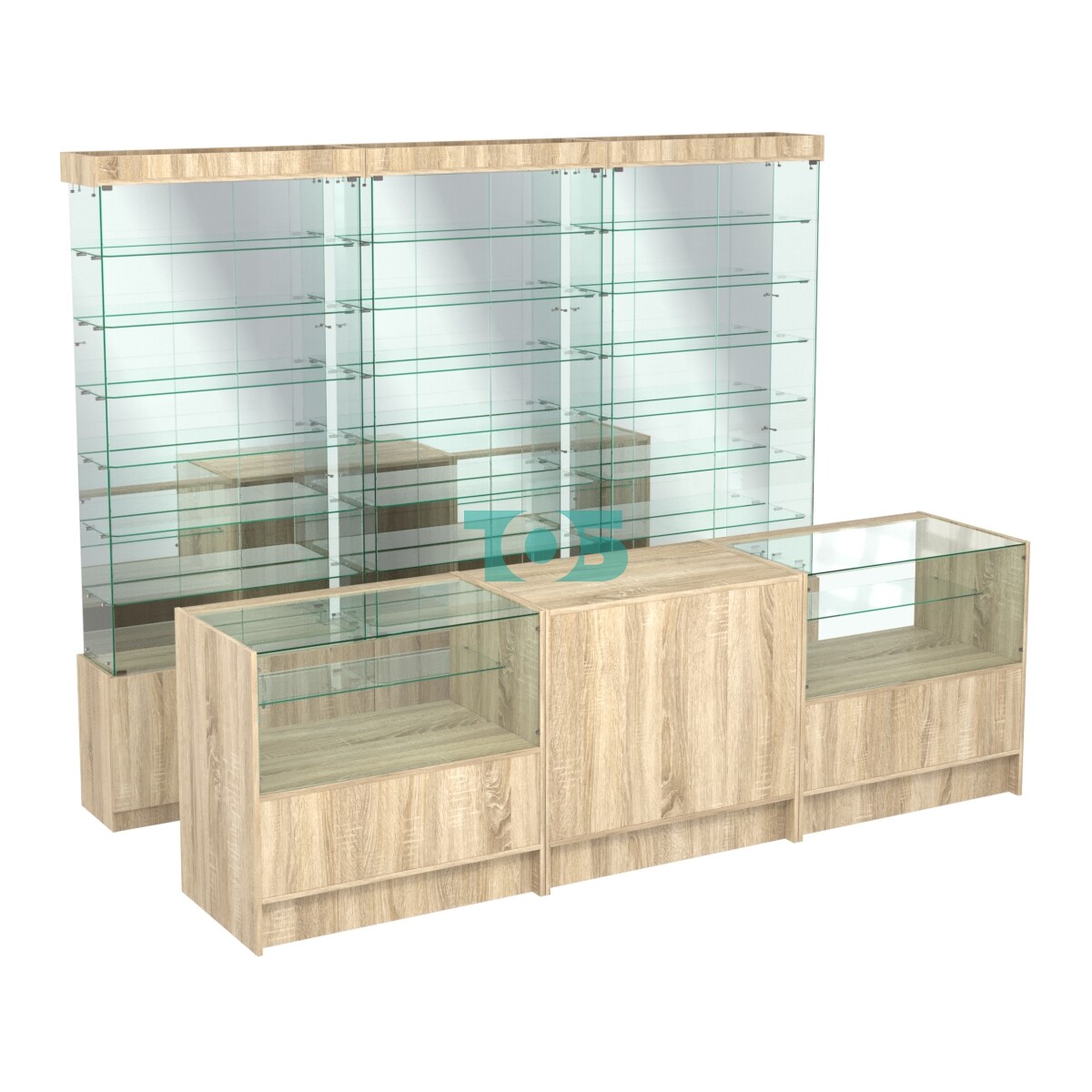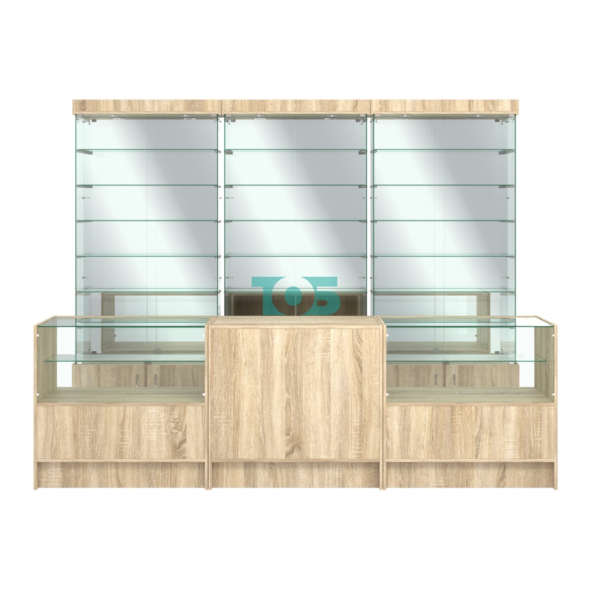 - три витрины ИС-32 с 6-ю полками, стеклянными дверками с замком, зеркальной задней стенкой и подсветкой;