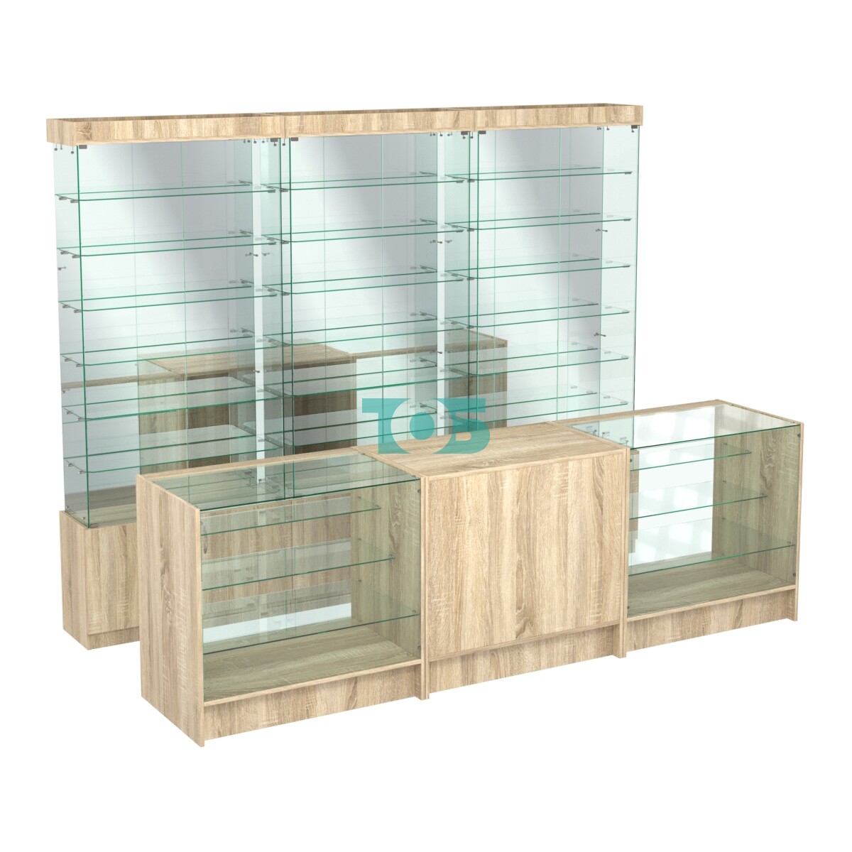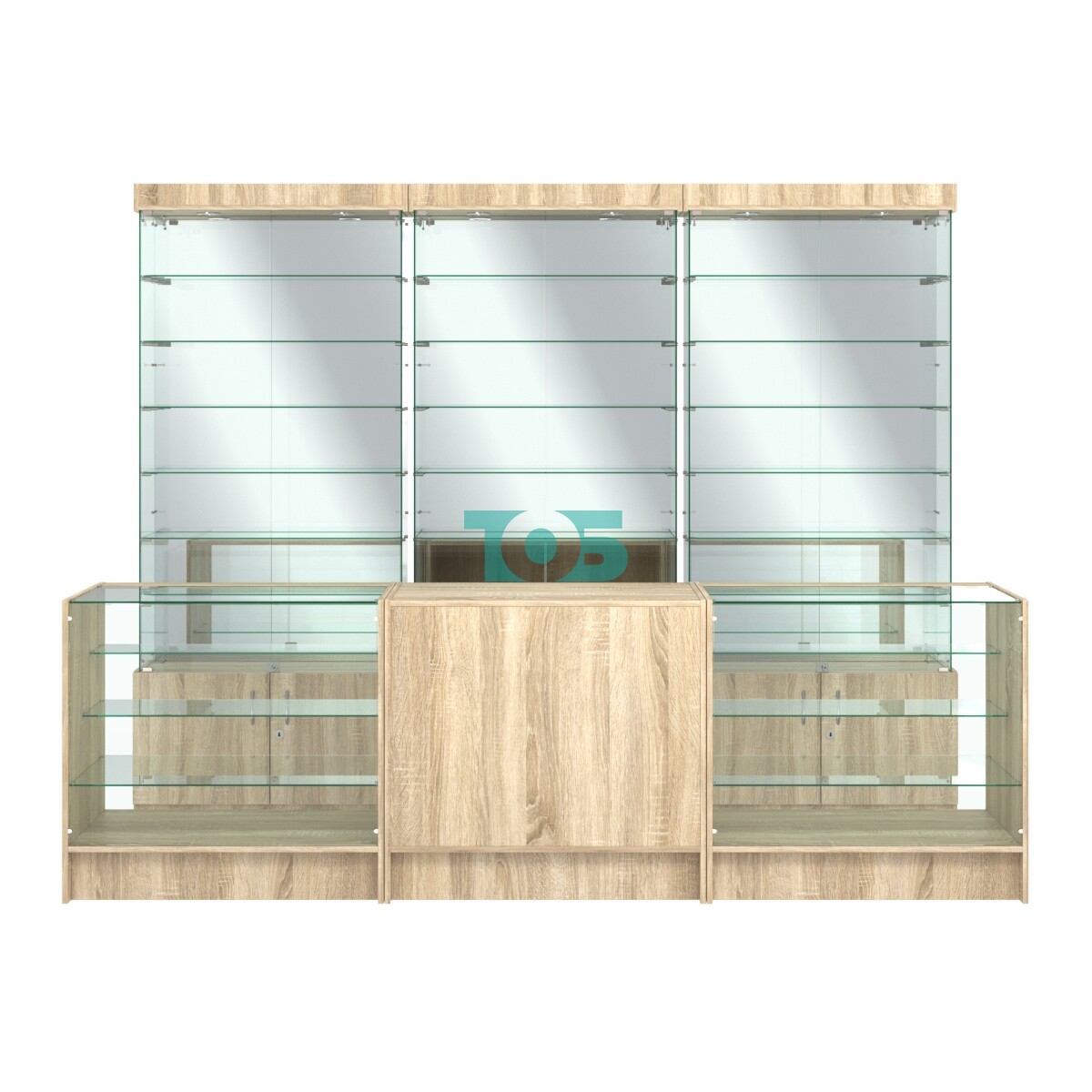 - три витрины ИС-32 с 6-ю полками, стеклянными дверками с замком, зеркальной задней стенкой и подсветкой;