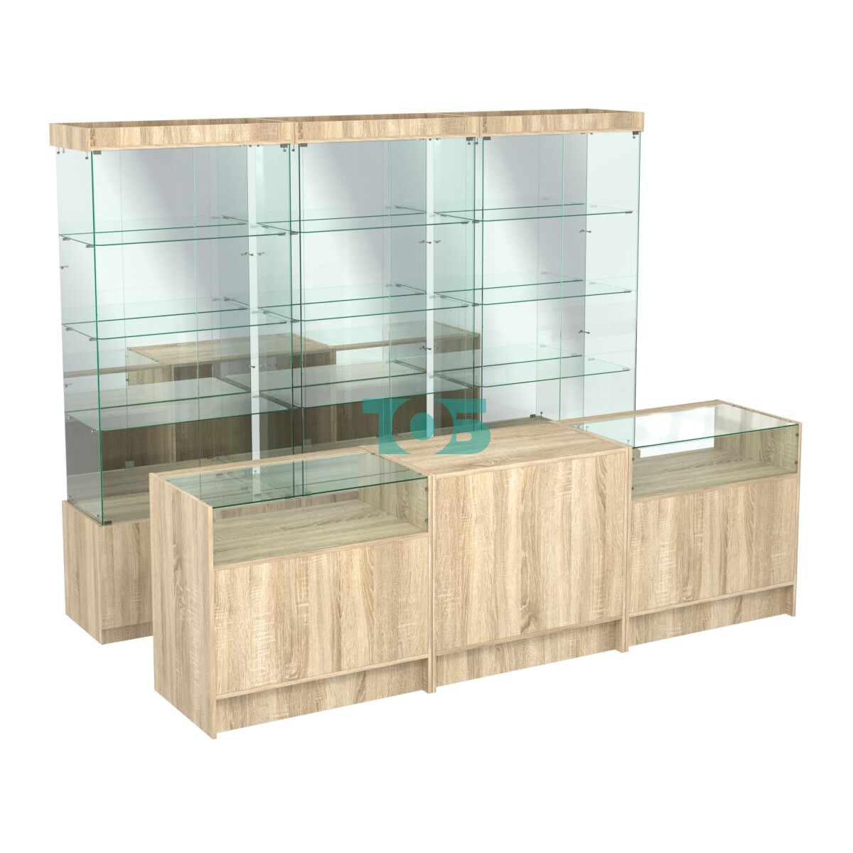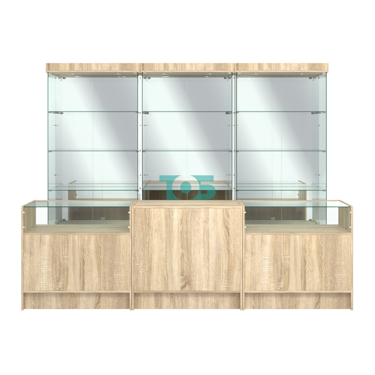 - три витрины ИС-03 с 3-мя полками, стеклянными дверками с замком, зеркальной задней стенкой и подсветкой;
