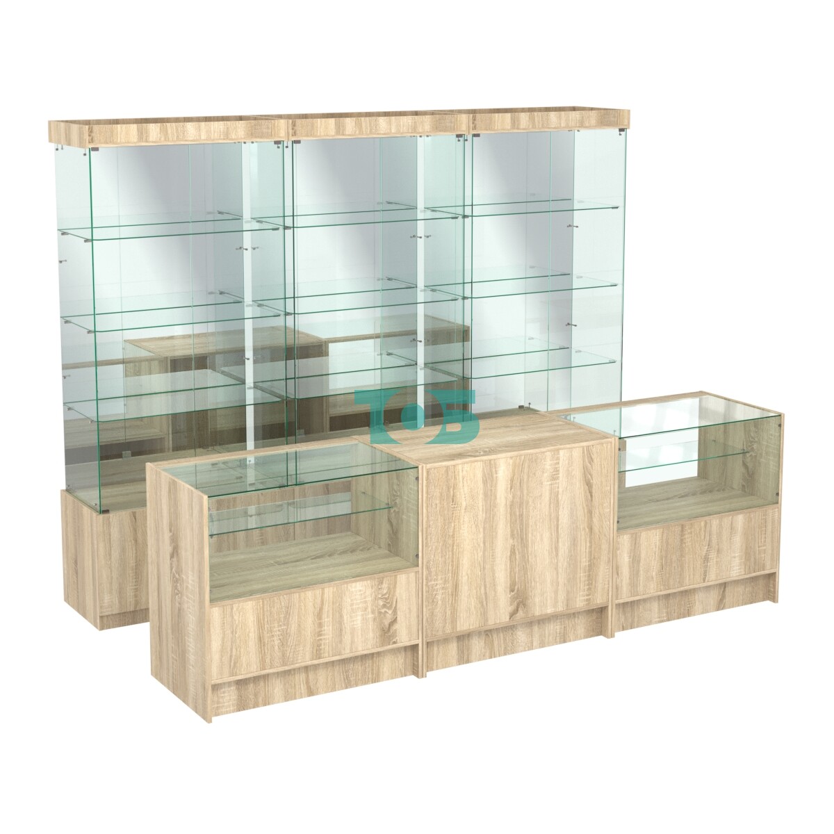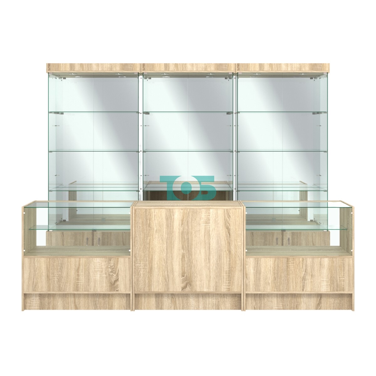 - три витрины ИС-03 с 3-мя полками, стеклянными дверками с замком, зеркальной задней стенкой и подсветкой;