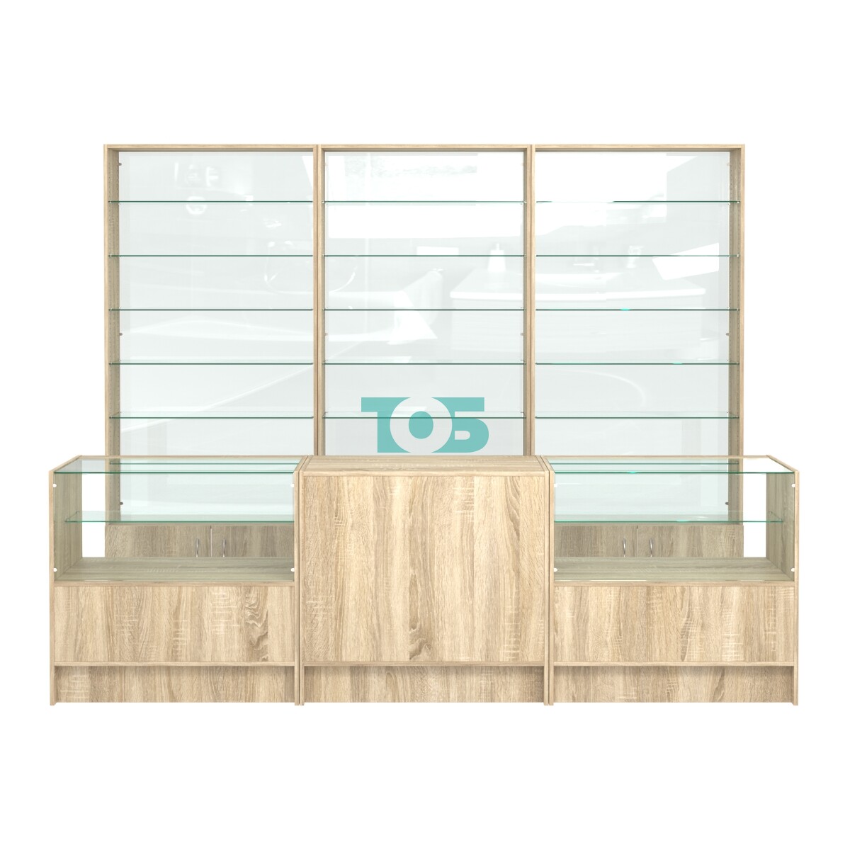 Количество стеклянных полок: 6 штук на каждый стеллаж.