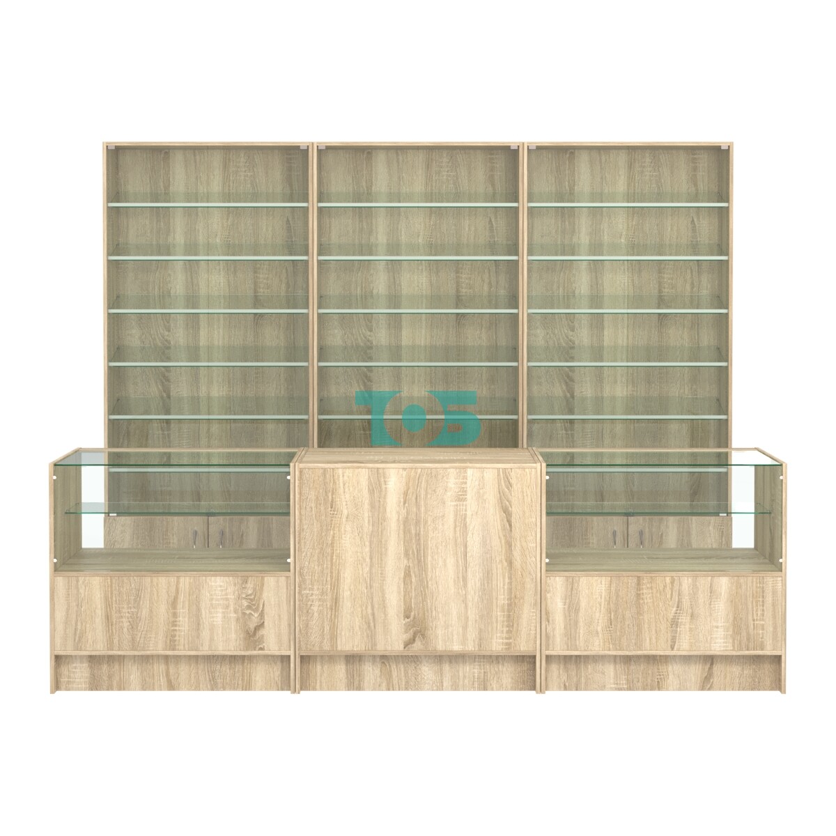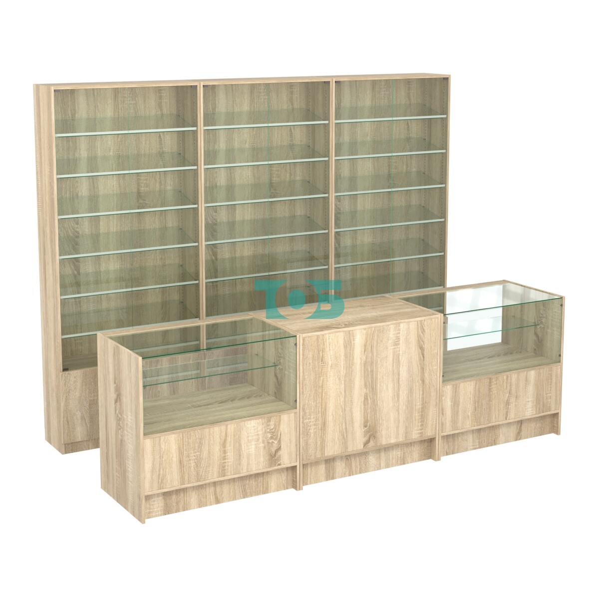 - три витрины SL-6 №12 с 6-ю наклонными полками и возможностью их регулировать по высоте через каждые два сантиметра, стеклянными дверками с замком и задней стенкой ДВП;