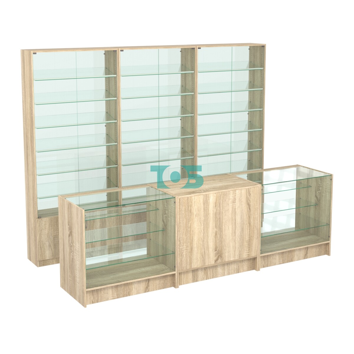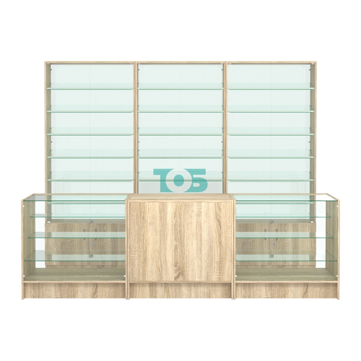 - три витрины SL-6 №12-1 с 6-ю наклонными полками и возможностью их регулировать по высоте через каждые два сантиметра, стеклянными дверками с замком и прозрачной задней стенкой;
