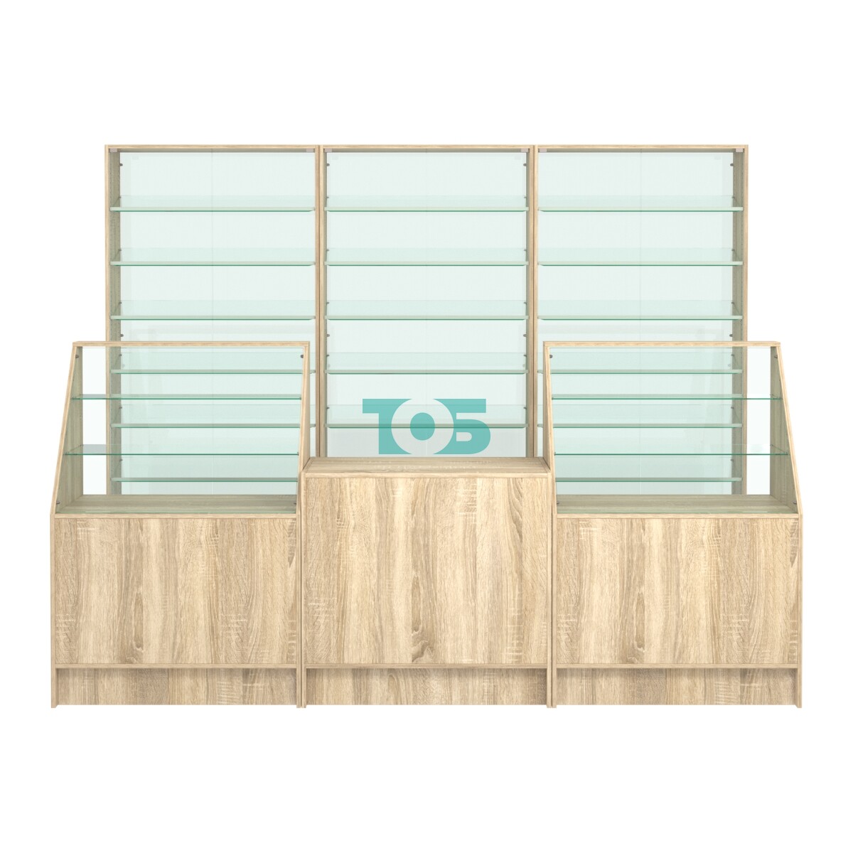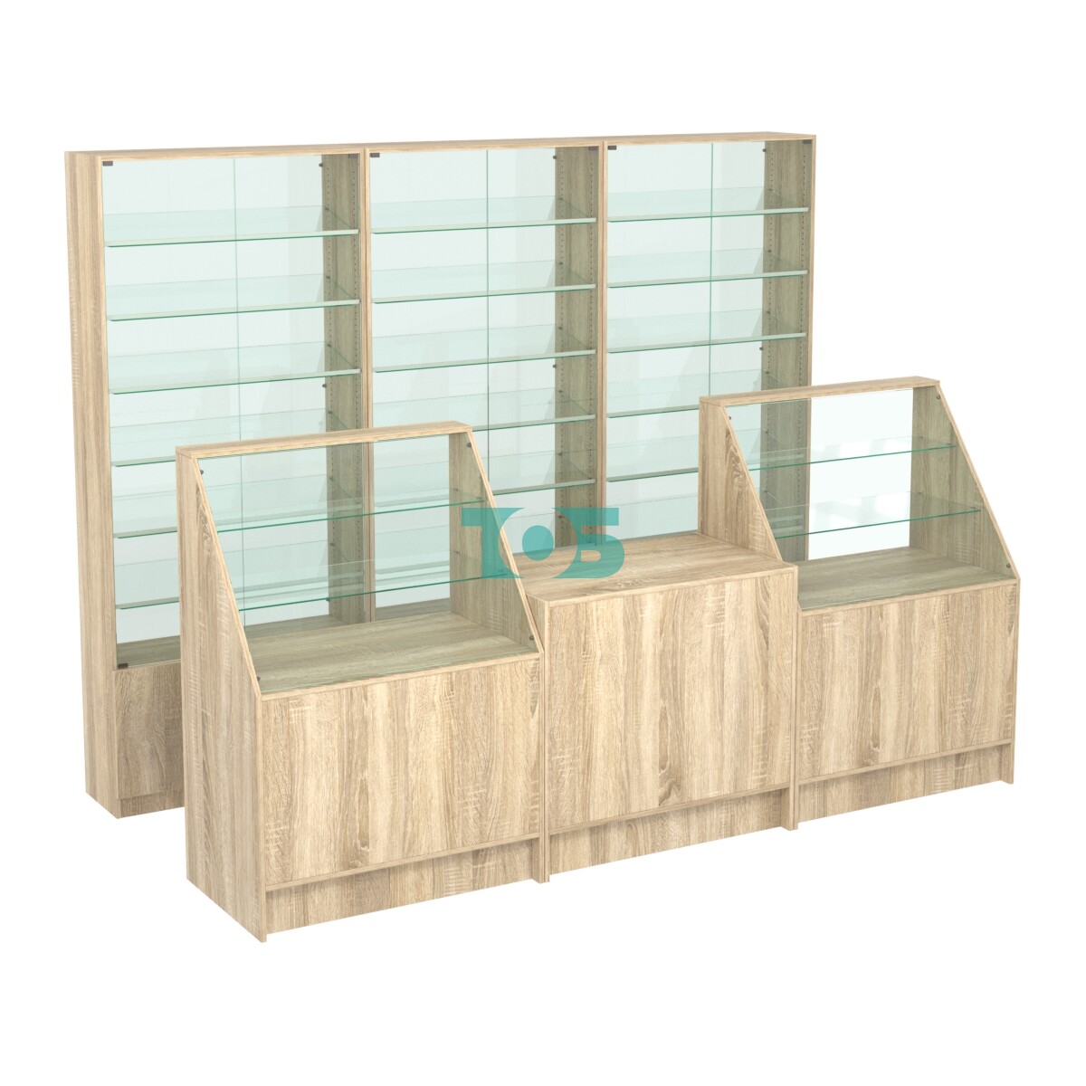 - три витрины SL-6 №12-1 с 6-ю наклонными полками и возможностью их регулировать по высоте через каждые два сантиметра, стеклянными дверками с замком и прозрачной задней стенкой;