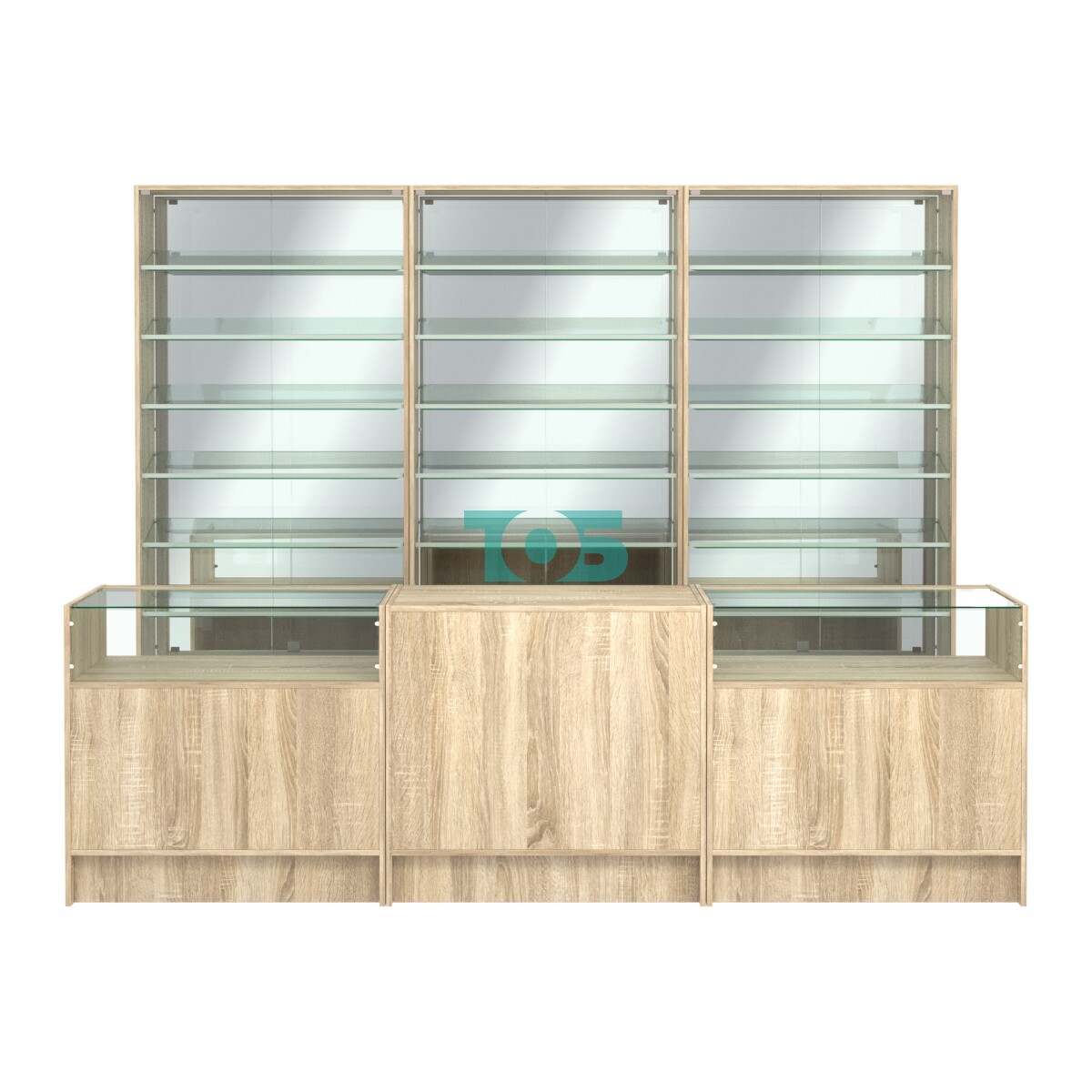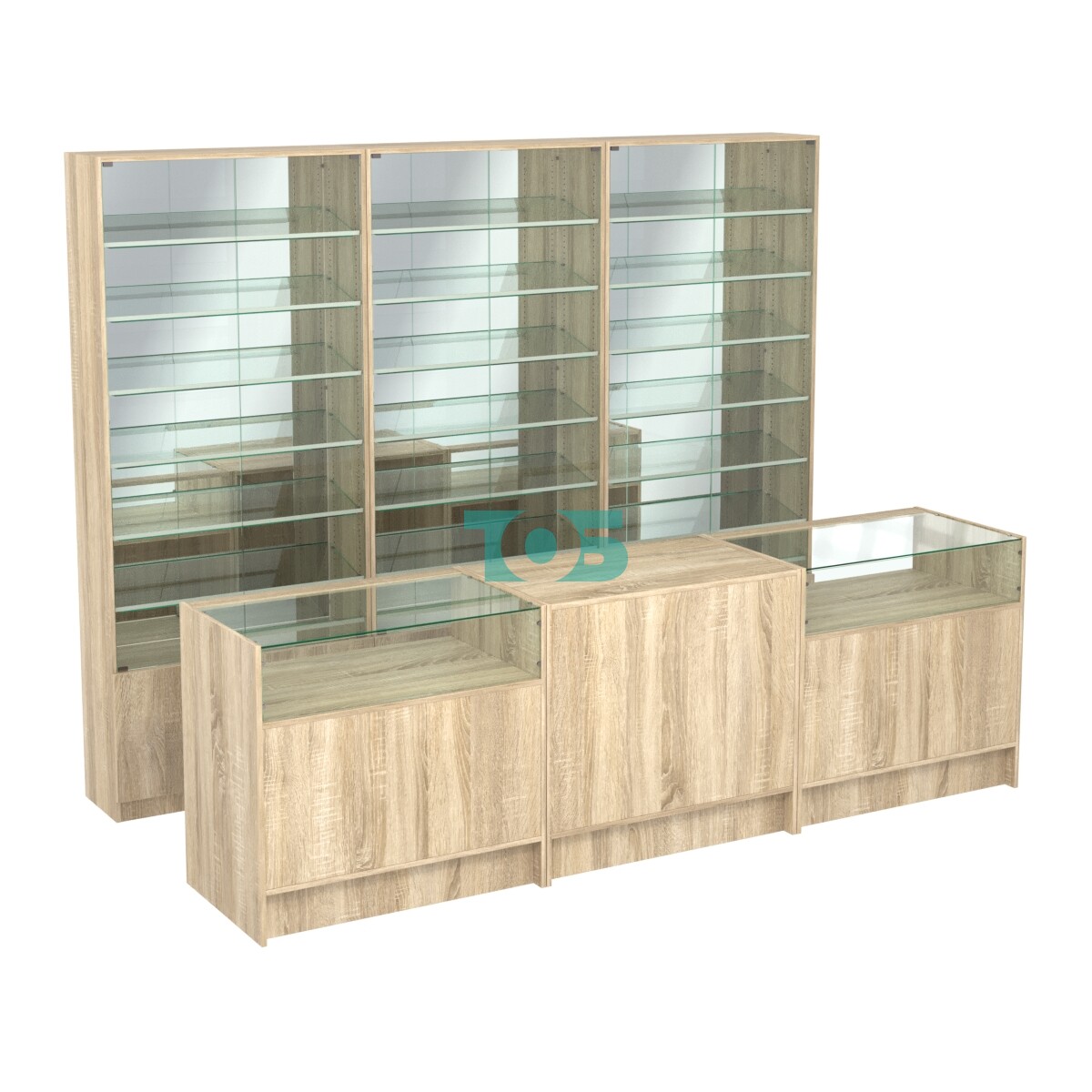 - три витрины SL-6 №12-2 с 6-ю наклонными полками и возможностью их регулировать по высоте через каждые два сантиметра, стеклянными дверками с замком и зеркальной задней стенкой;