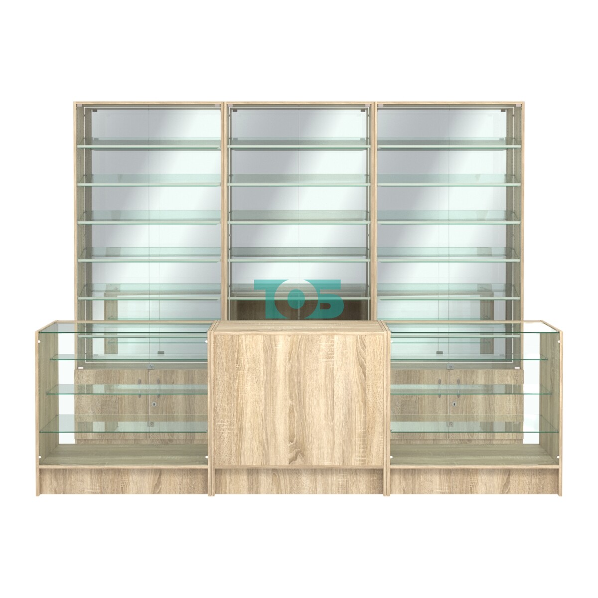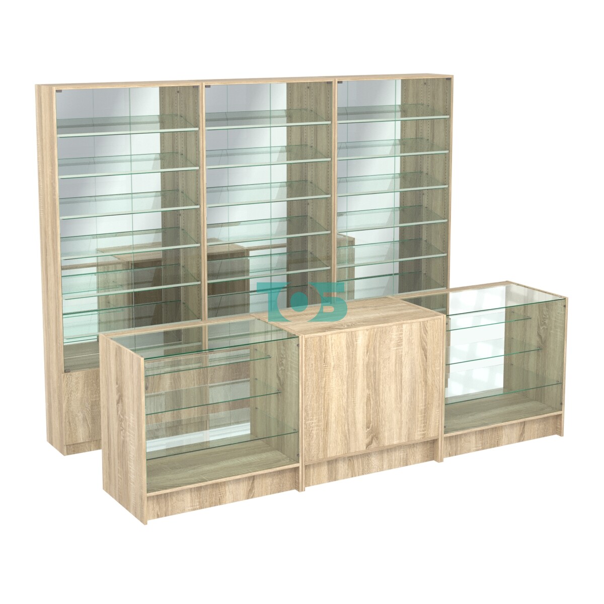 - три витрины SL-6 №12-2 с 6-ю наклонными полками и возможностью их регулировать по высоте через каждые два сантиметра, стеклянными дверками с замком и зеркальной задней стенкой;