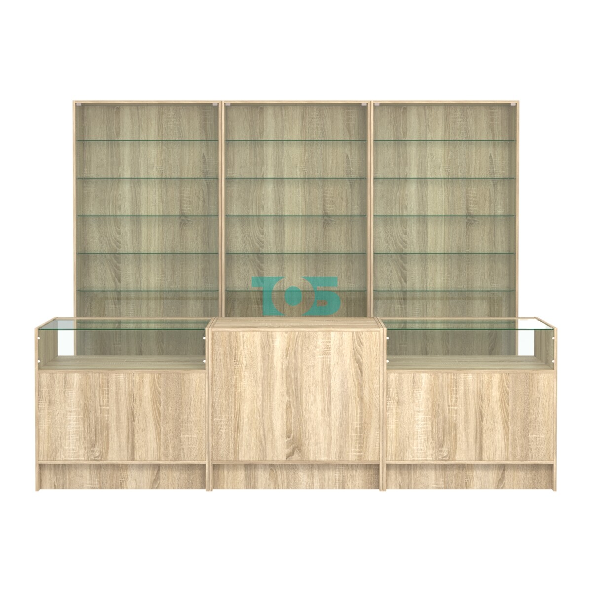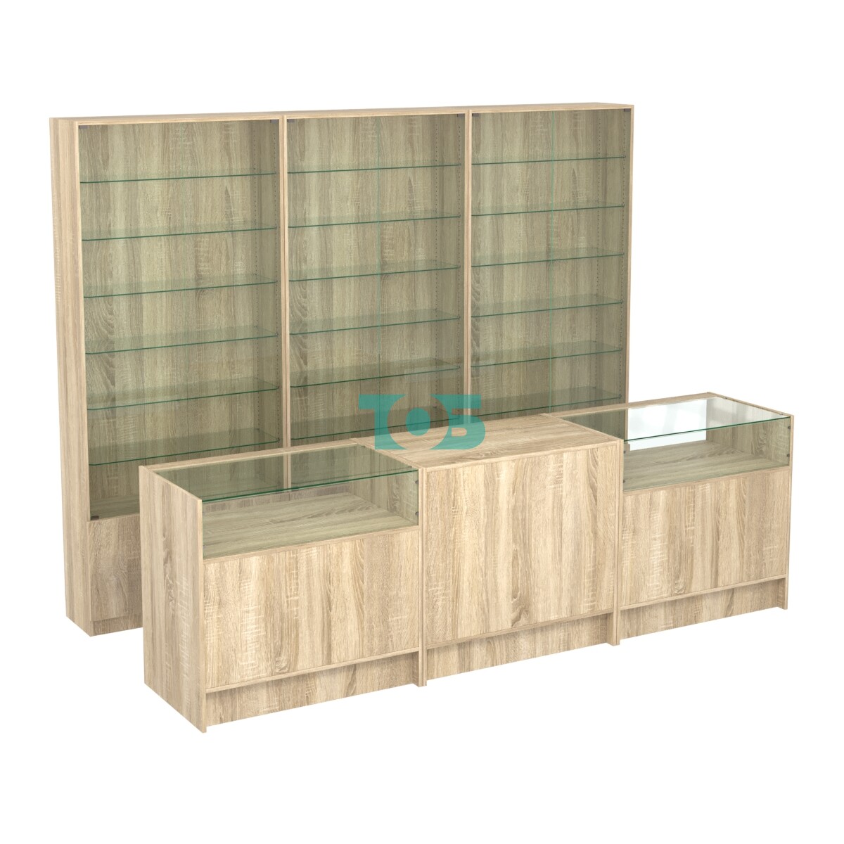 - три витрины NE-6 №12 с 6-ю полками и возможностью их регулировать по высоте через каждые два сантиметра, стеклянными дверками с замком и задней стенкой ДВП;
