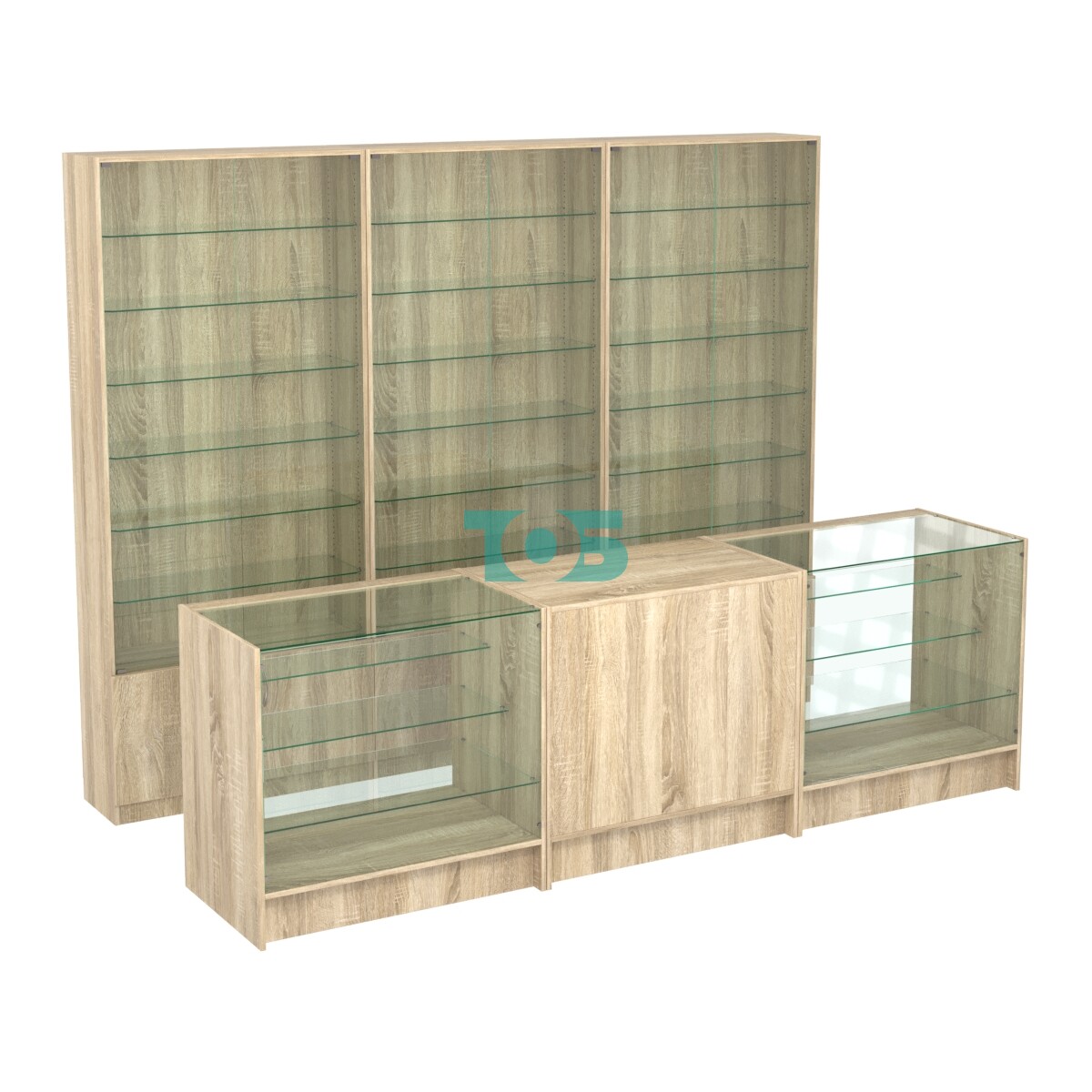 - три витрины NE-6 №12 с 6-ю полками и возможностью их регулировать по высоте через каждые два сантиметра, стеклянными дверками с замком и задней стенкой ДВП;