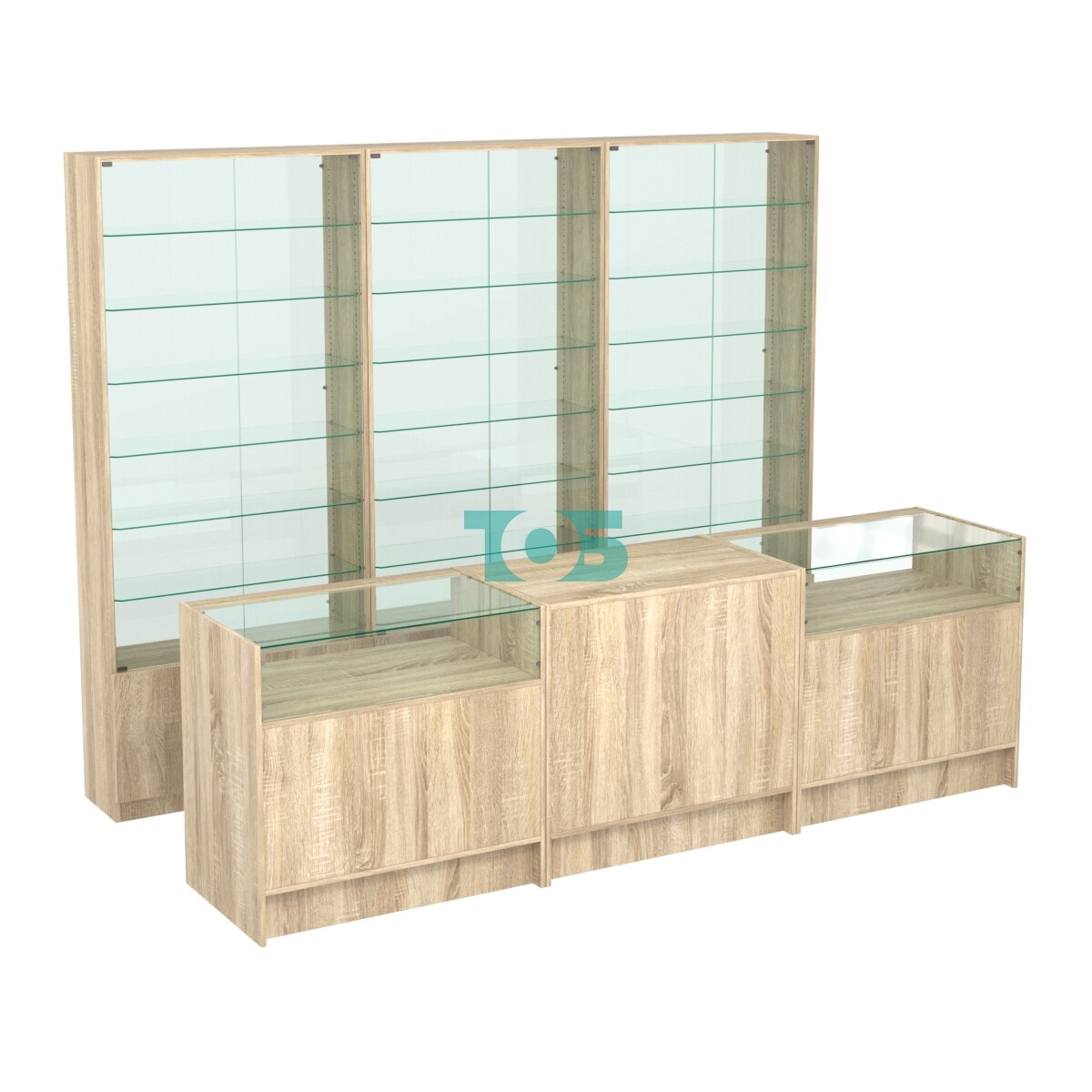 - три витрины NE-6 №12-1 с 6-ю полками и возможностью их регулировать по высоте через каждые два сантиметра, стеклянными дверками с замком и прозрачной задней стенкой;