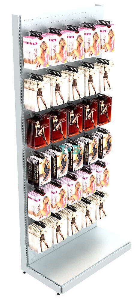 - задняя стенка стеллажа имеет перфорированные отверстия, в которые вставляются крючки и вывешивается товар - упаковки с колготами, гольфами, носками и чулками;
