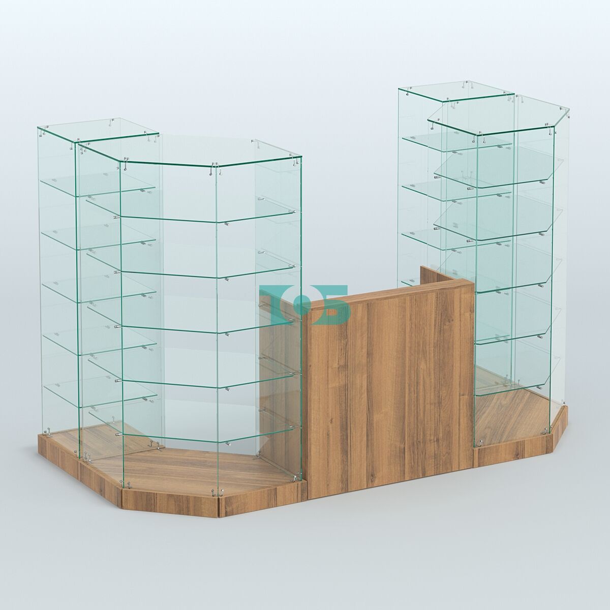 Полки: в павильоне предусмотрено по пять стеклянных полок на каждой стороне, расстояние между полками составляет 246 мм, что позволяет удобно разместить товары.