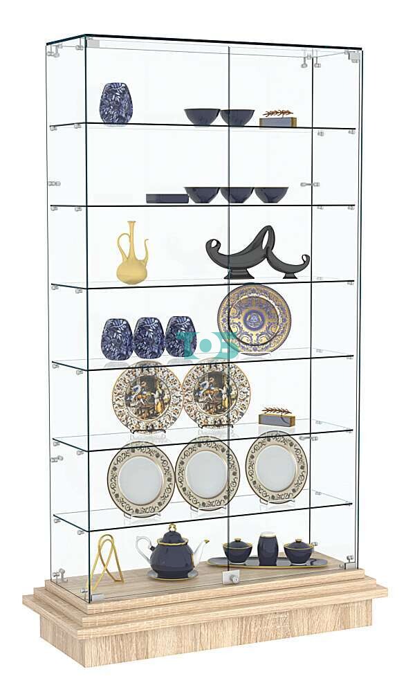 Задняя стенка: прозрачная, что способствует визуальному расширению пространства и позволяет видеть содержимое витрины с разных углов.