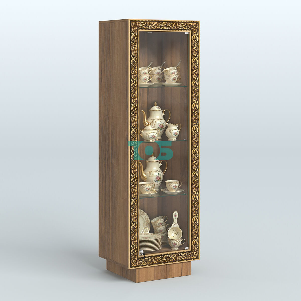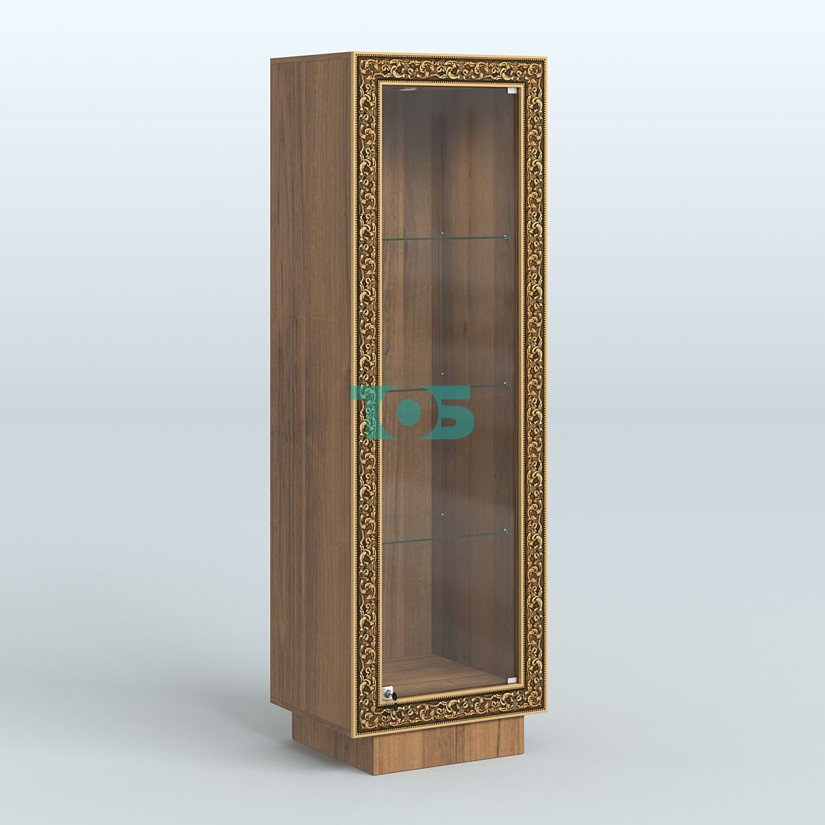 Фасадная часть: декорирована цветными молдингами под золото, которые подчёркивают чёткость линий и помогают вписать витрину в интерьер любого стиля.